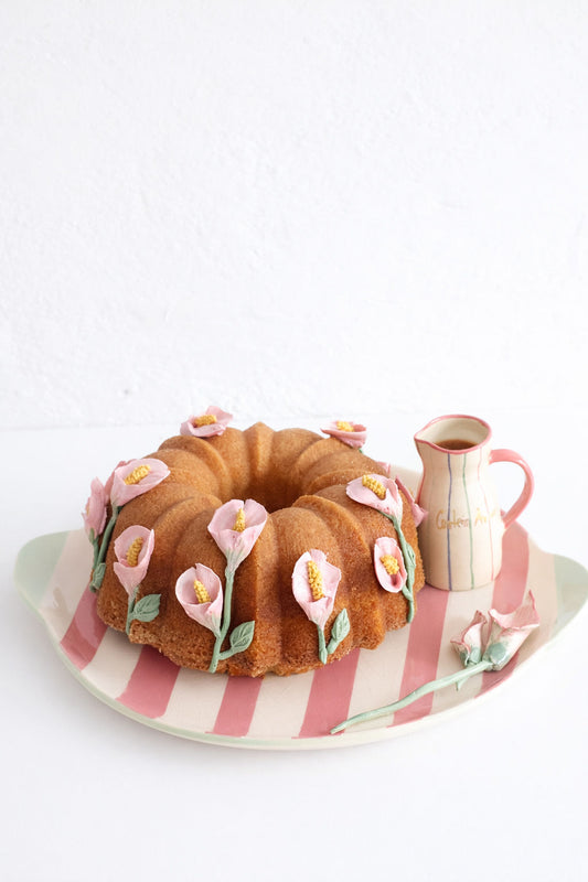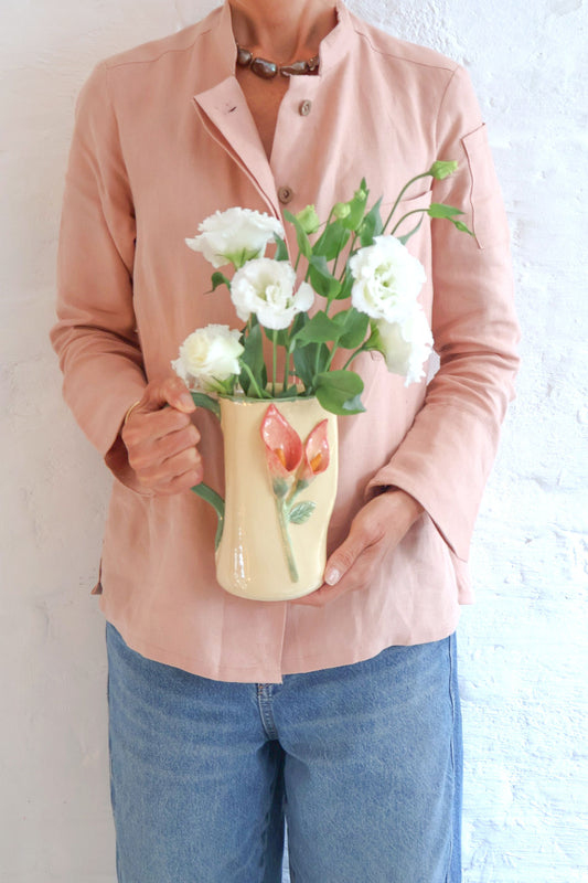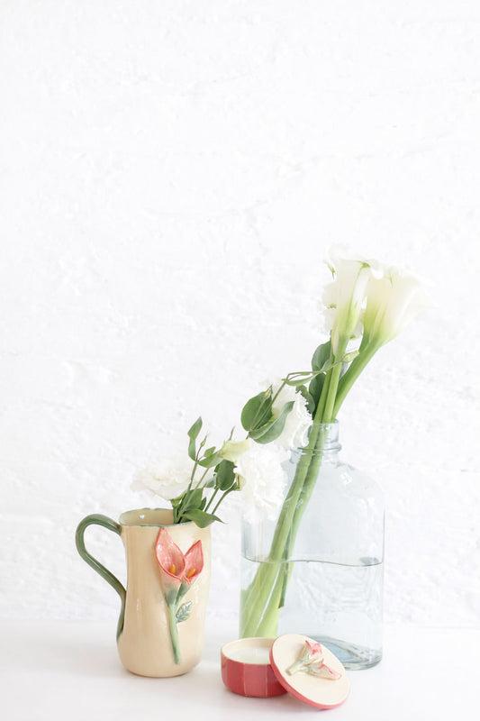 Inspirada na calla, flor que simboliza pureza, renascimento e transformação, a coleção ganha forma em cerâmicas de curvatura suave e orgânica, desenhadas pela Jáy como um gesto de florescimento. Cada peça é única, como uma flor que se abre. Assim como cada mãe, cada história, cada vínculo.