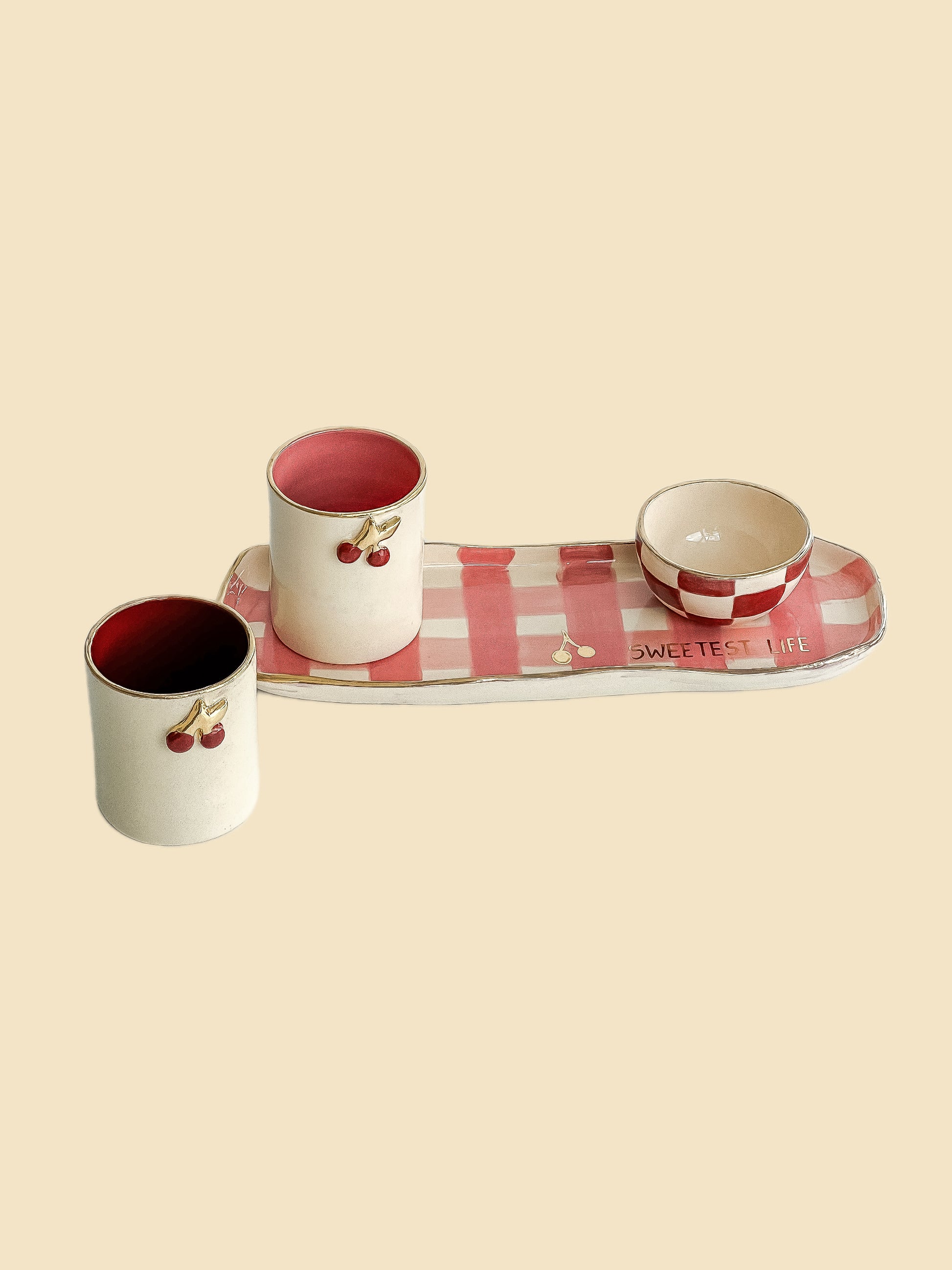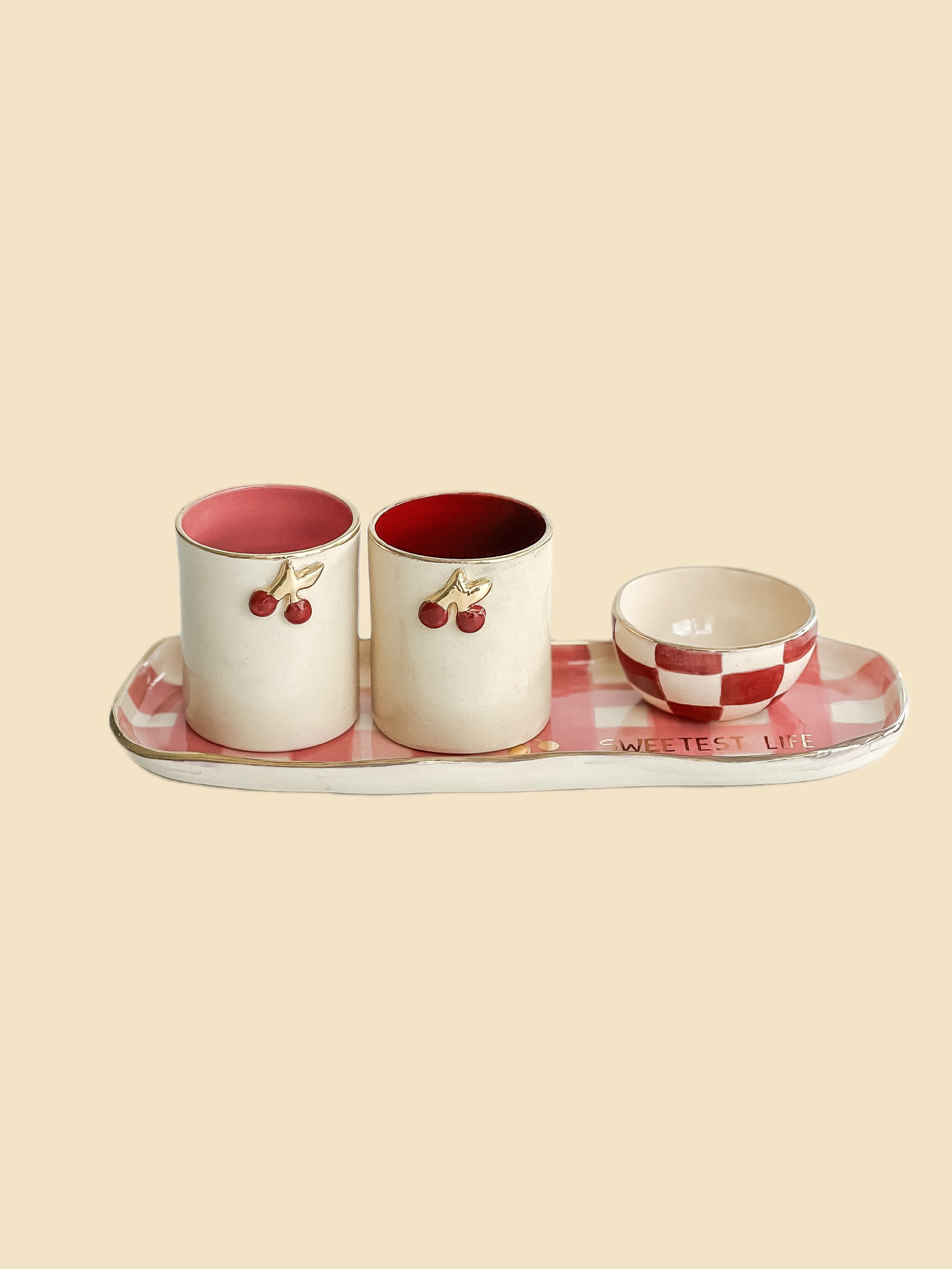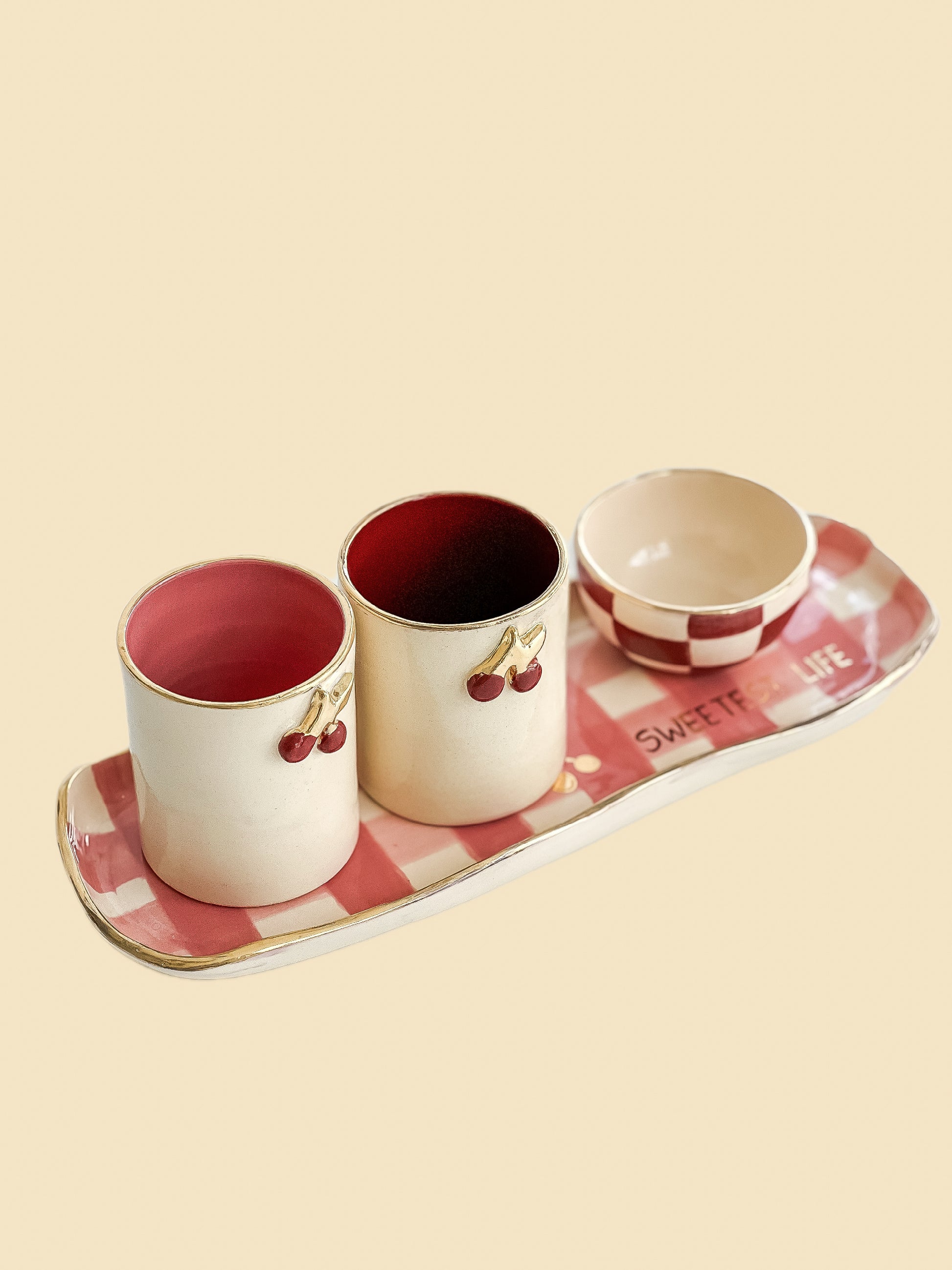 Descrição: Bandeja xadrez rosa com detalhes em ouro e escrito Sweetest Life, acompanhada de dois copinhos (um rosa, um vermelho com mini cereja em ouro) + mini bowl xadrez.