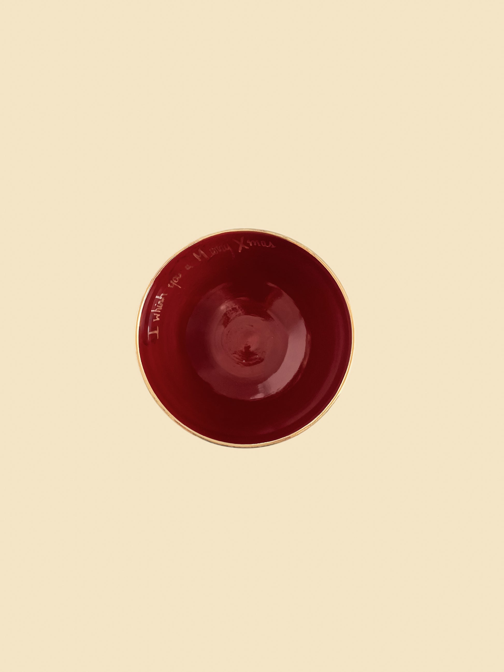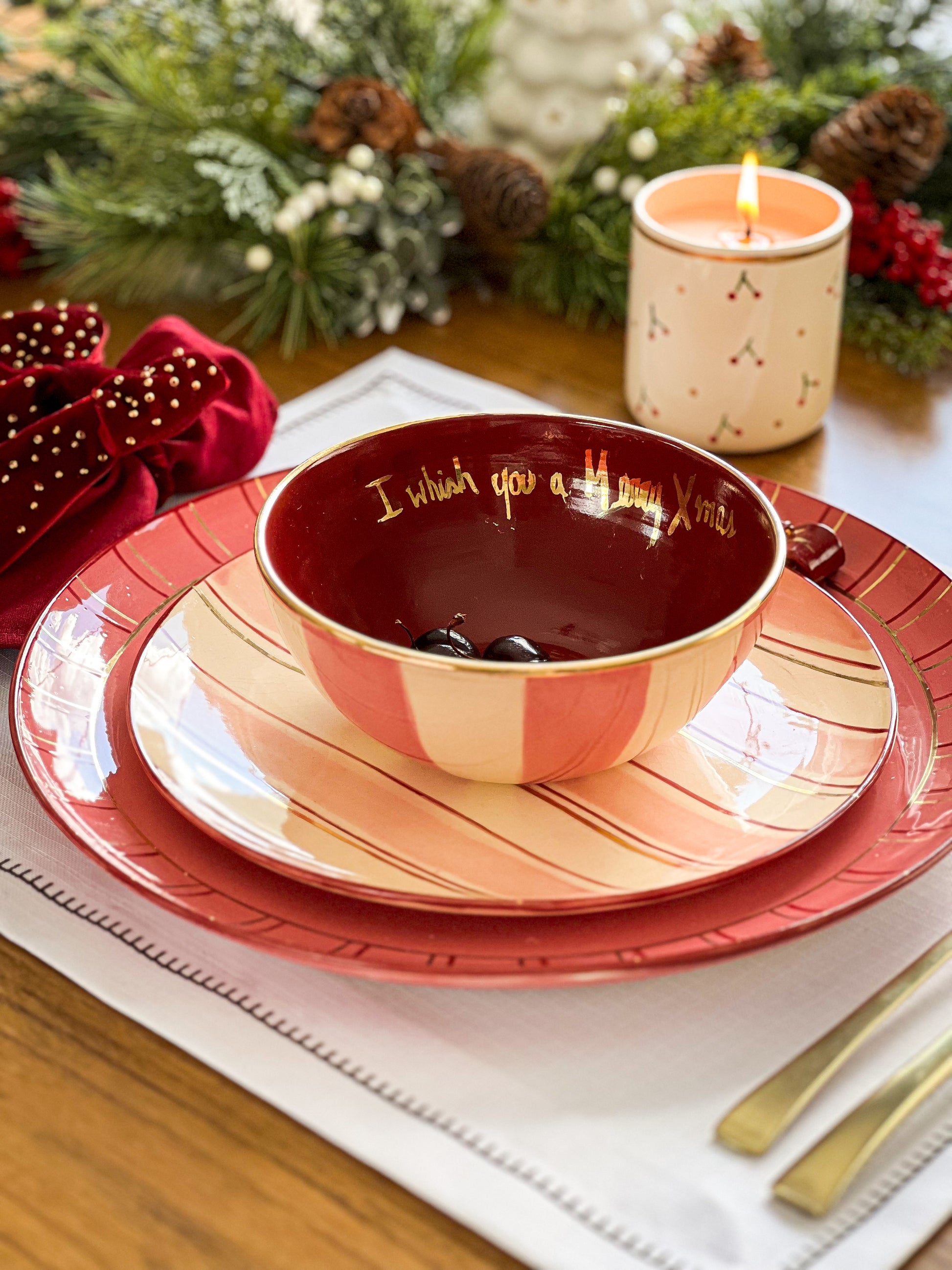 Descrição: Bowl médio com interior vermelho e exterior listrado rosa com detalhes em ouro e inscrição Wish you a merry xmas.