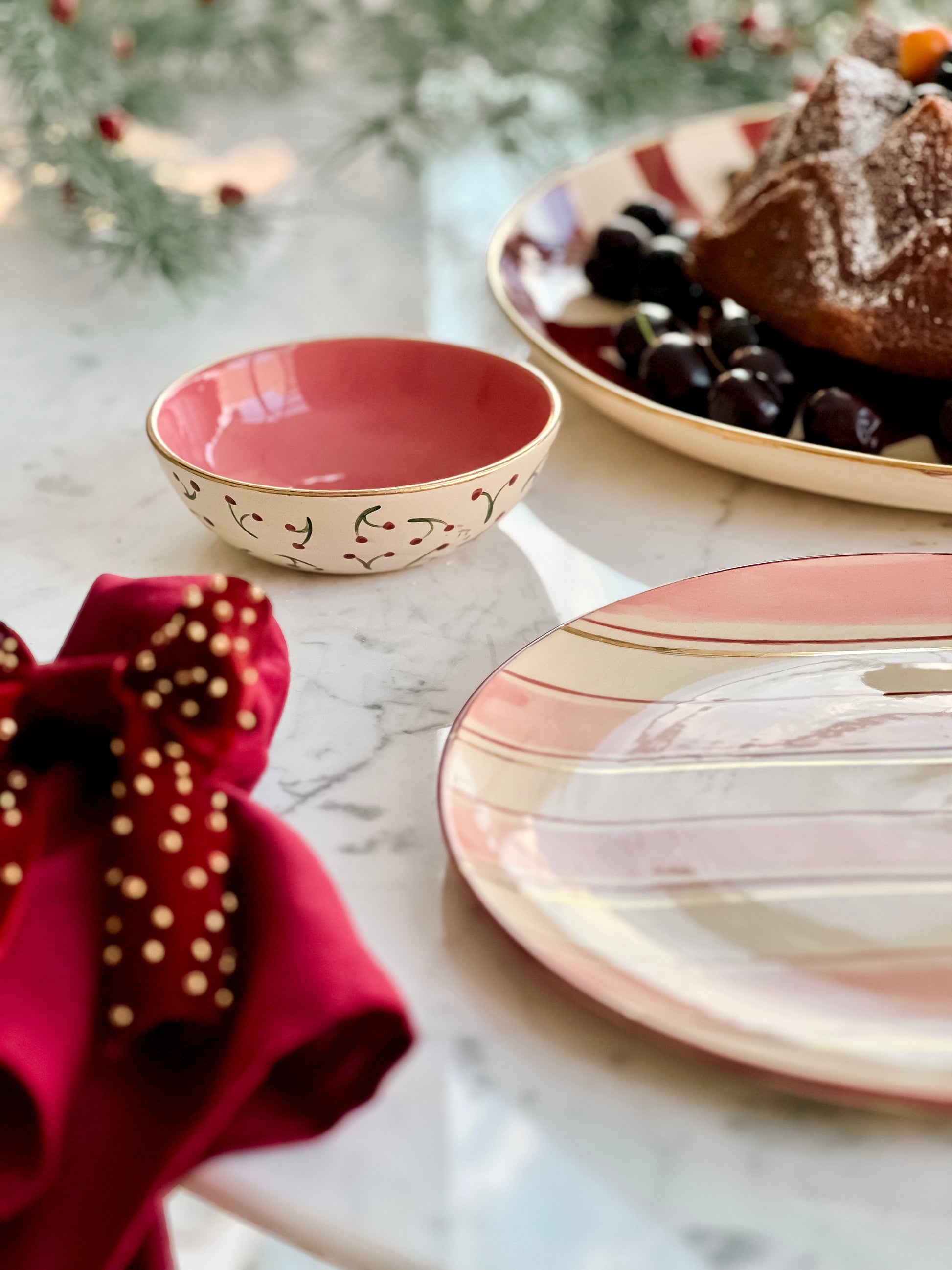 Descrição: Bowl pequeno com interior rosa e exterior estampado com mini cerejas.