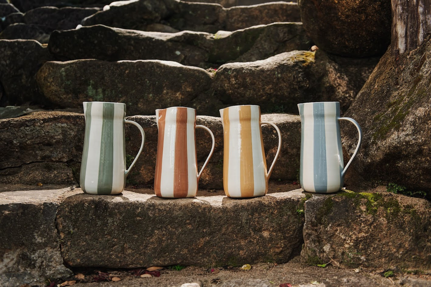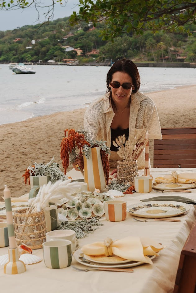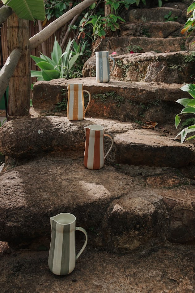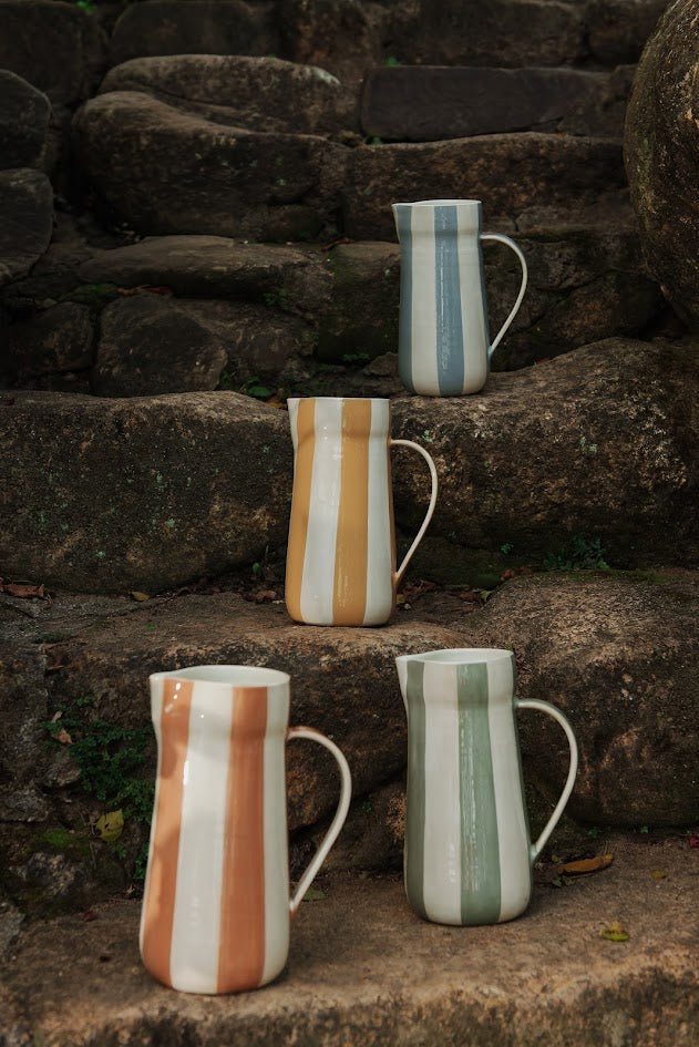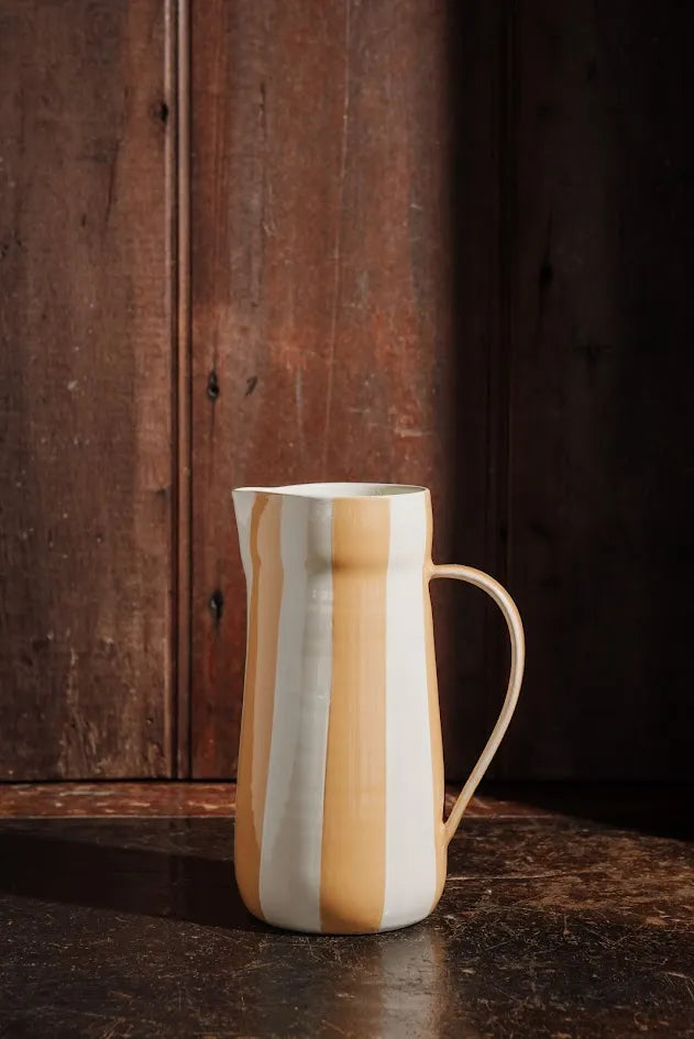 Descrição: Jarro em cerâmica com acabamento cru vintage e listras pintadas à mão no tom amarelo da coleção. Peça versátil, com presença visual. Disponível em quatro cores da coleção.
