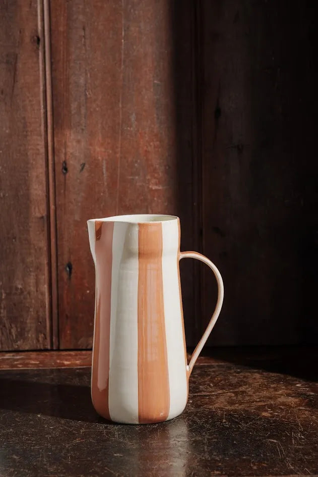 Descrição: Jarro em cerâmica com acabamento cru vintage e listras pintadas à mão no tom nude da coleção. Peça versátil, com presença visual. Disponível em quatro cores da coleção.