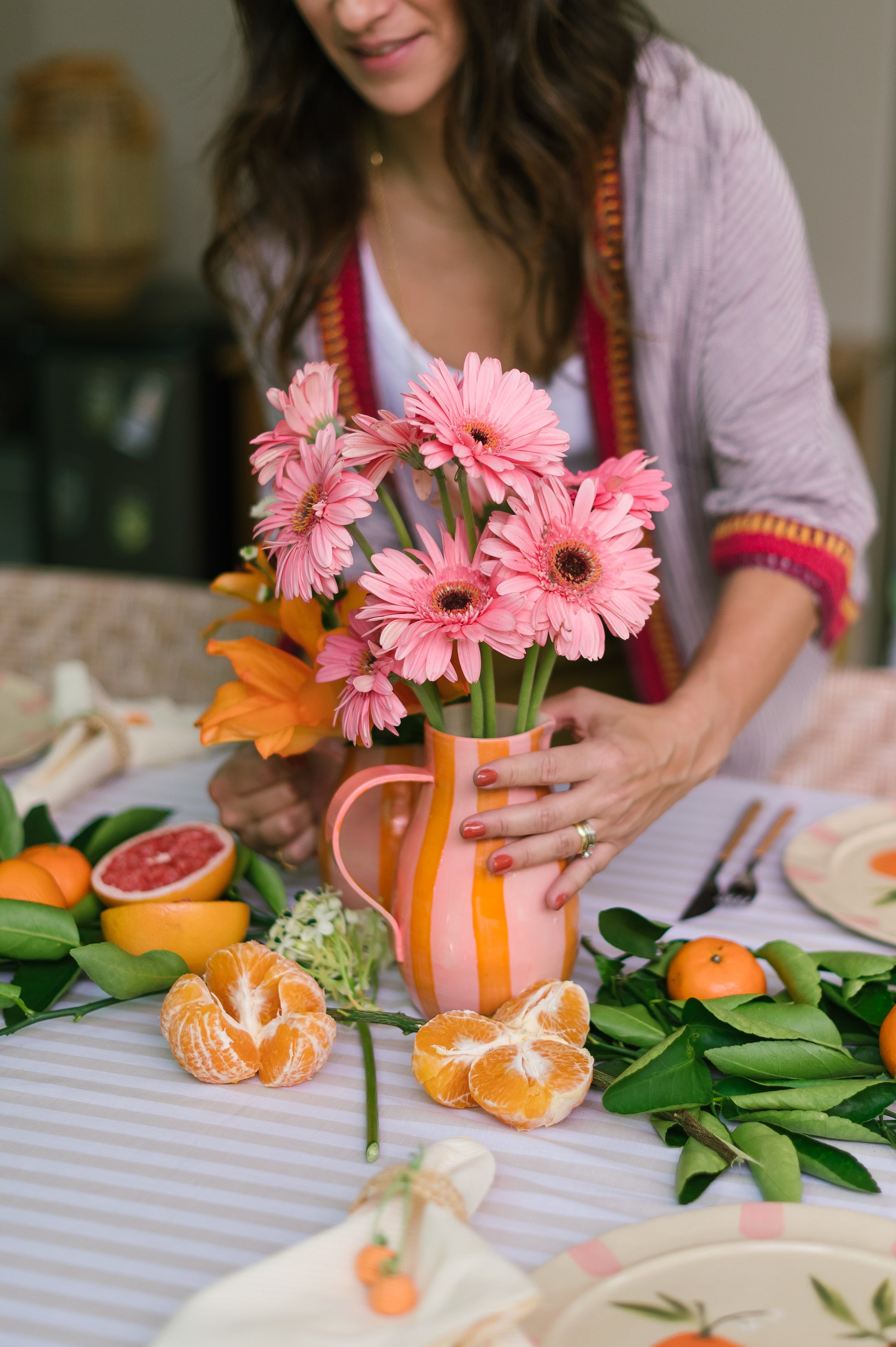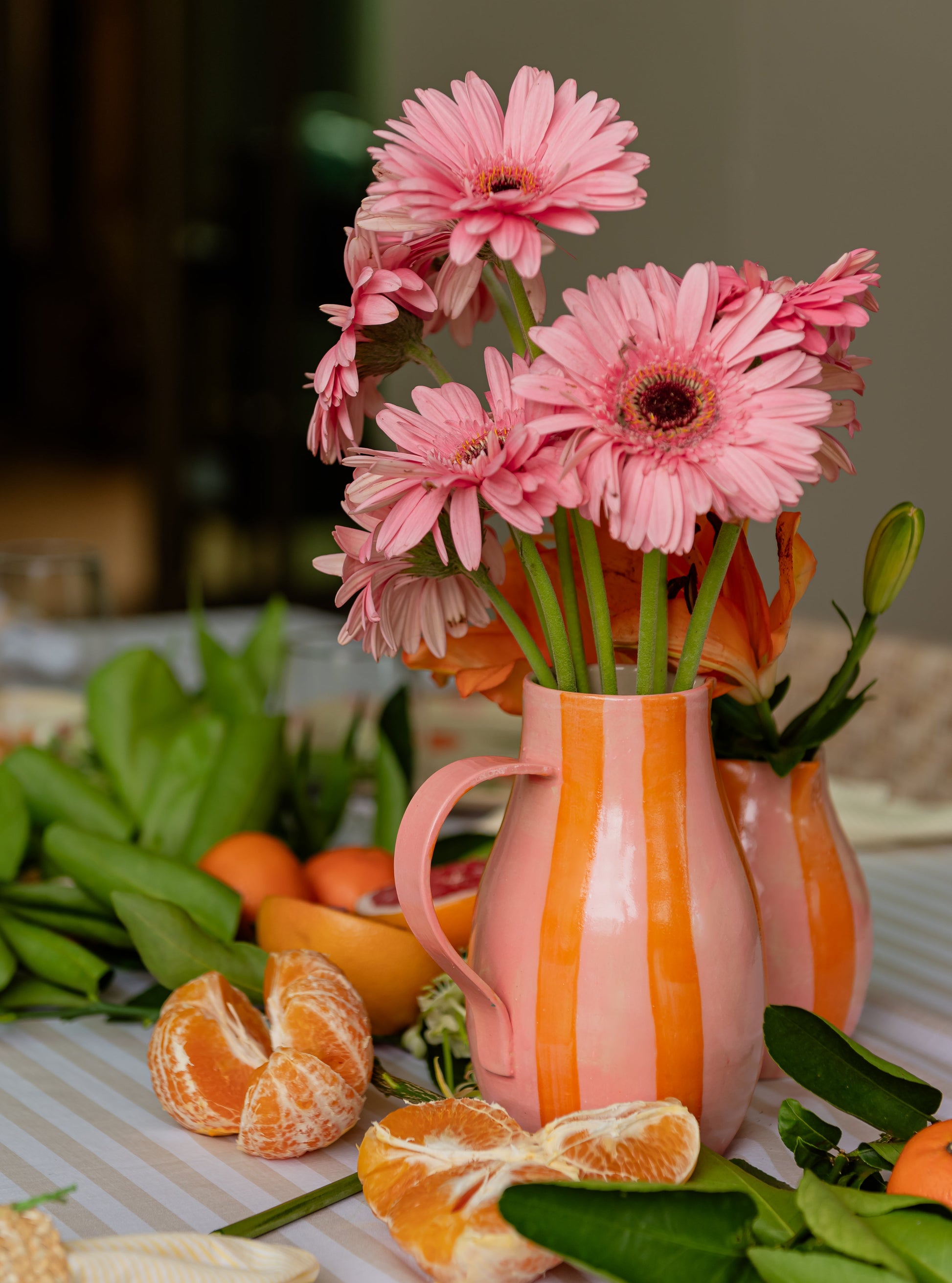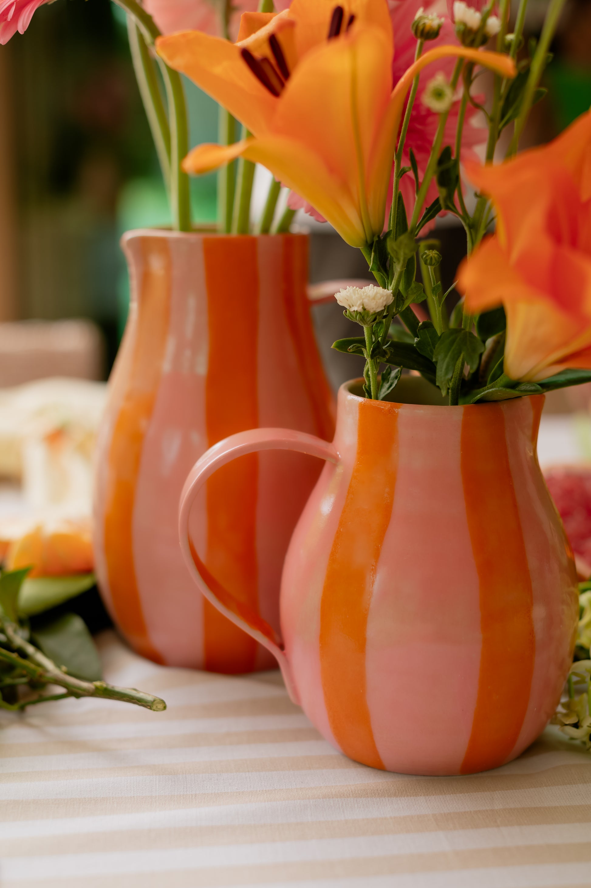Descrição: Jarro em cerâmica de alta temperatura, pintado à mão em rosa com listras em laranja. Uma peça compacta, vibrante e artesanal, que reflete o frescor e a paleta solar da coleção Mandarine.