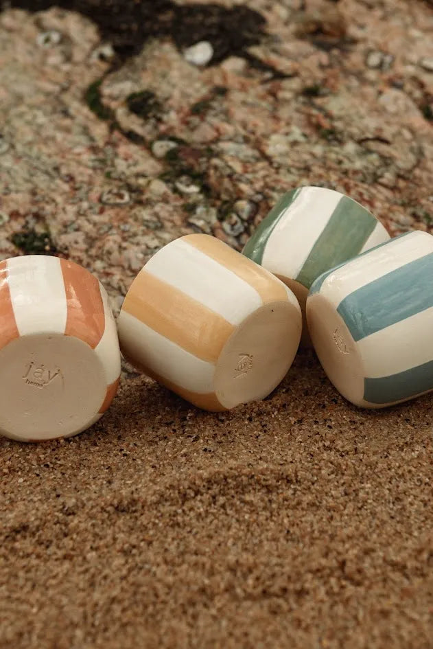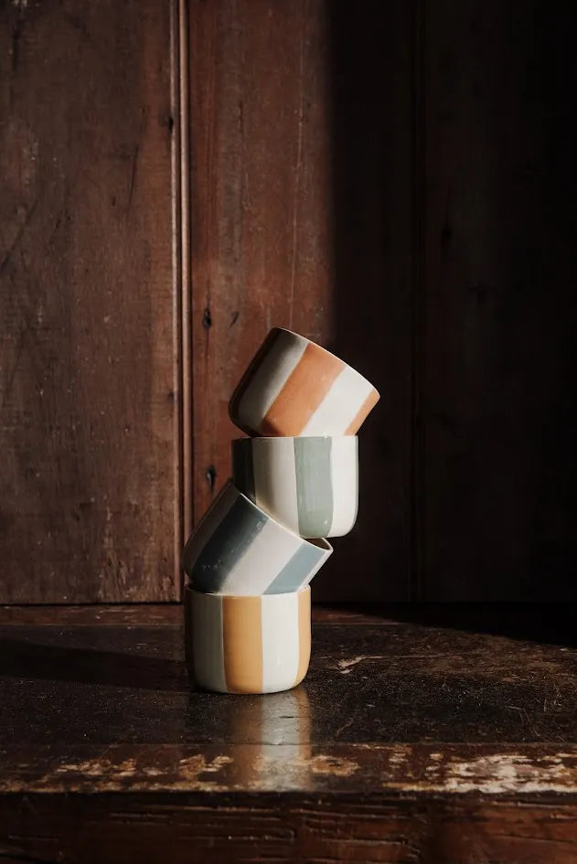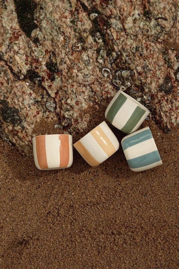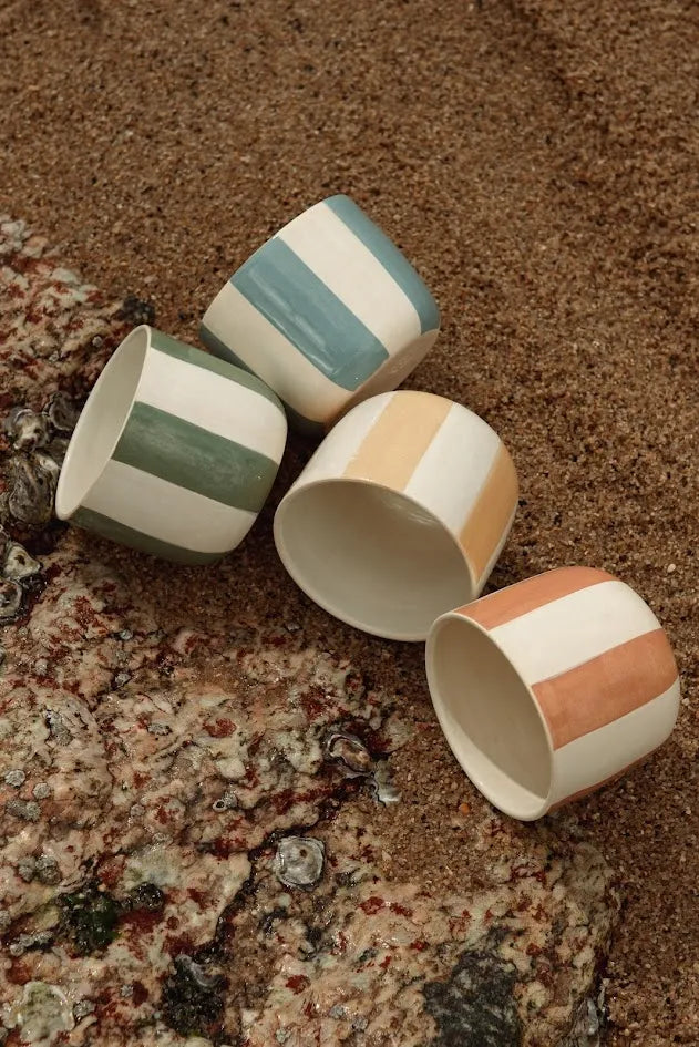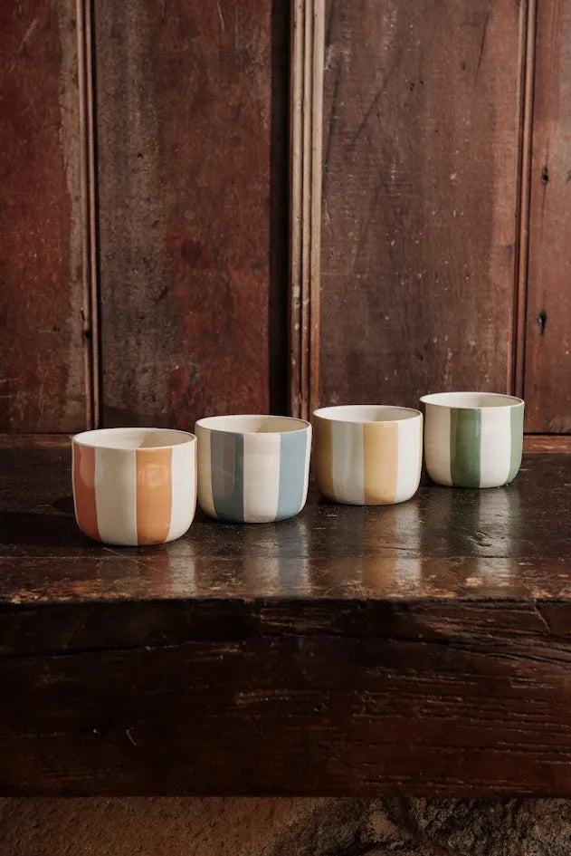 Descrição: Kit com quatro copos abaulados listrados pintados em cerâmica, em quatro opções de cores: verde, azul, amarelo e nude.