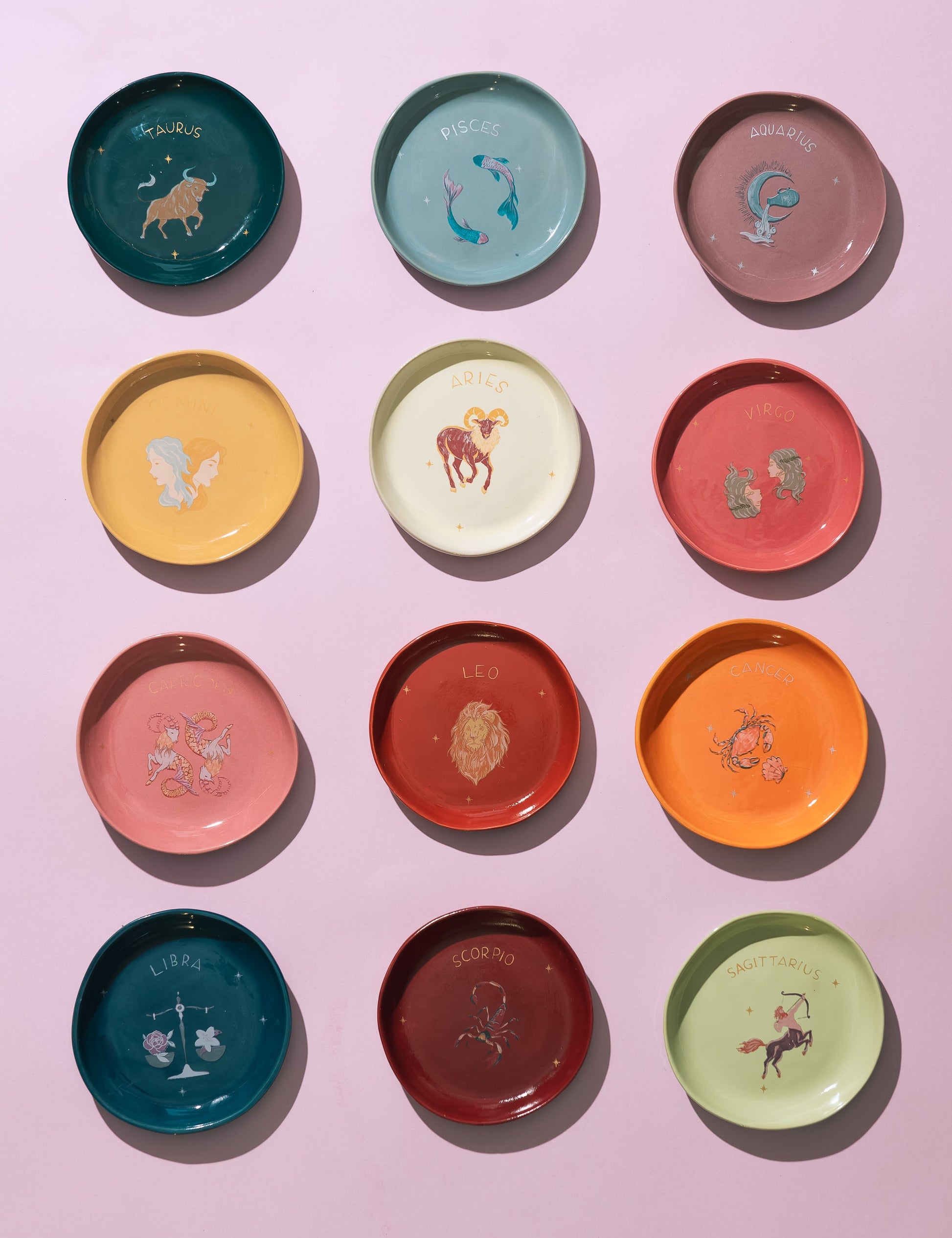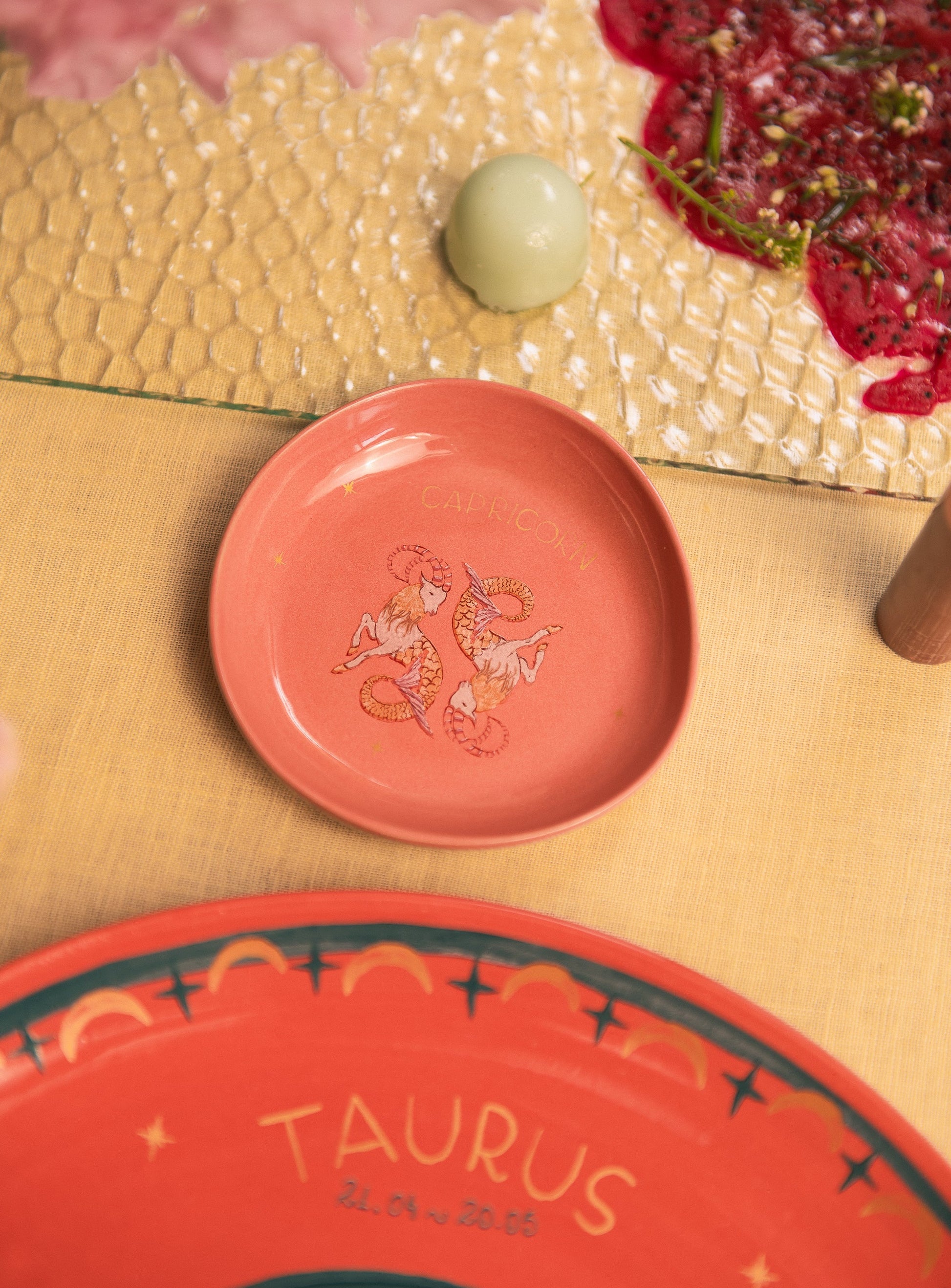 Pratinho em cerâmica moldado e pintado á mão para decorar um cantinho especial , uma mesa de centro junto com outros objetos ou para colocar ao lado da mesa de cabeceira . Com estampa referente a cada signo exclusiva , essa é uma peça ideal para presentear e ser presenteada.