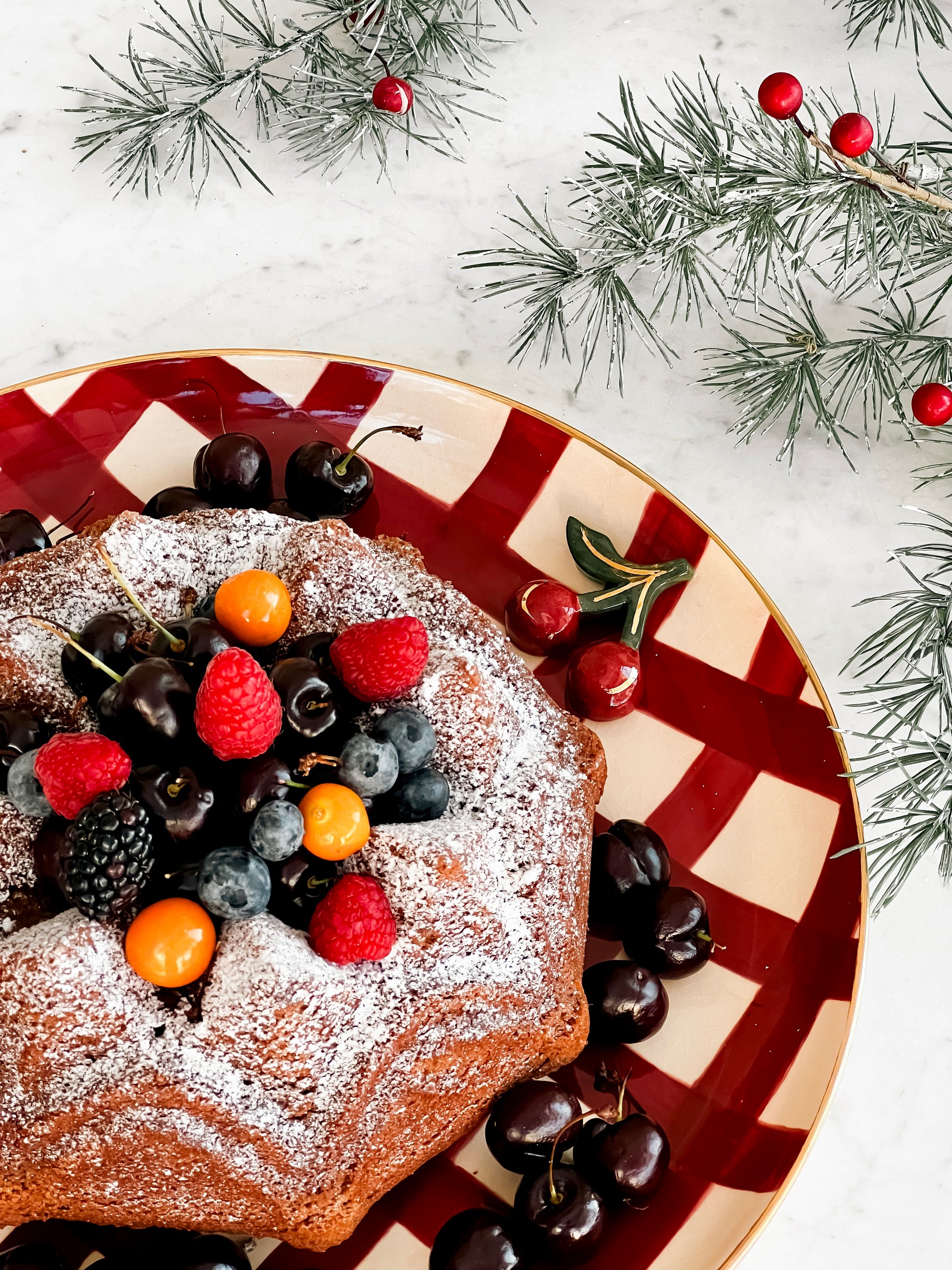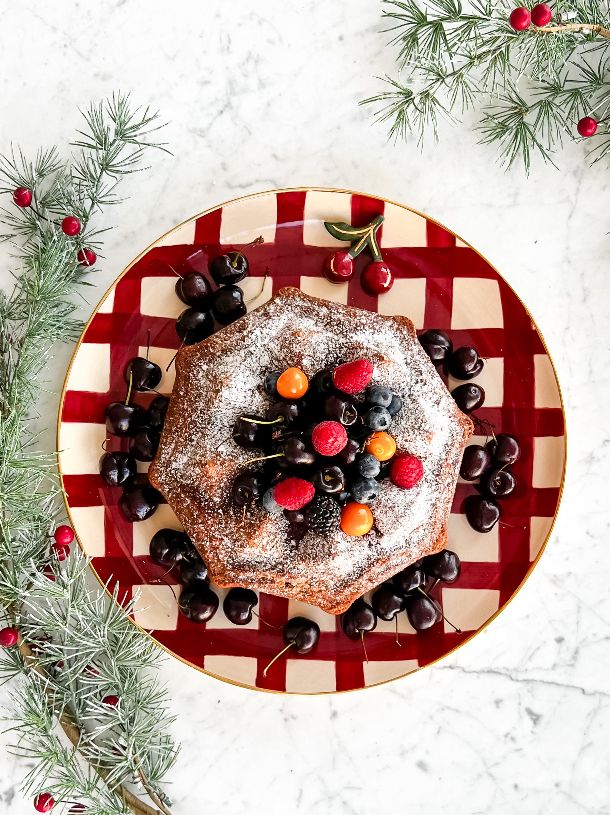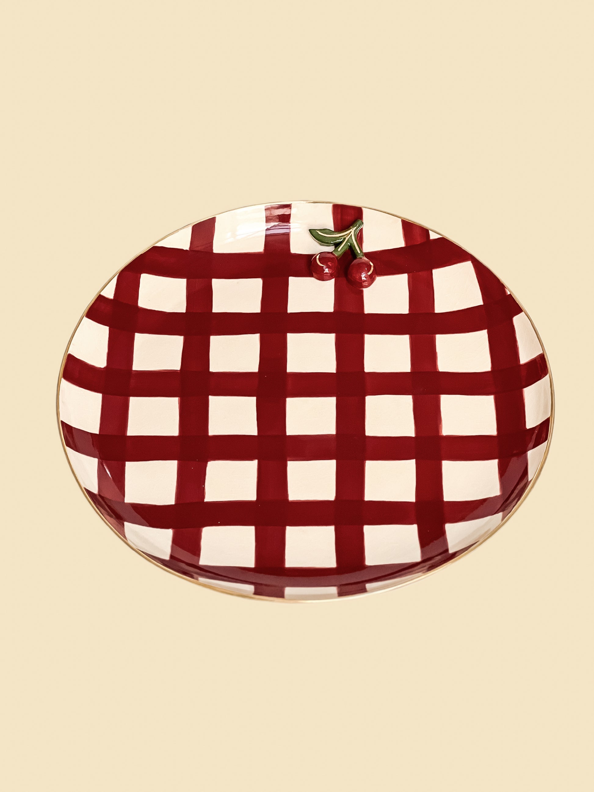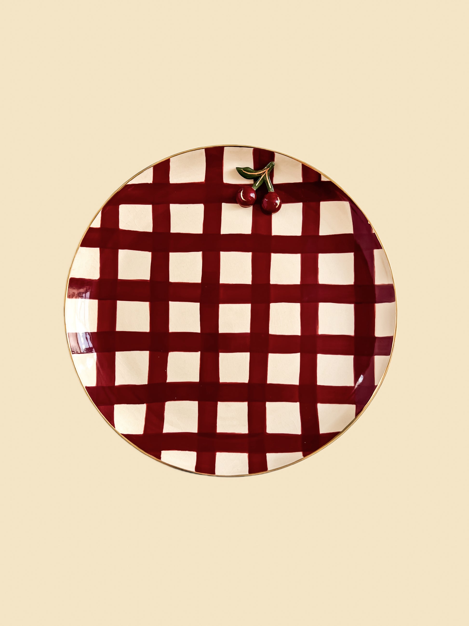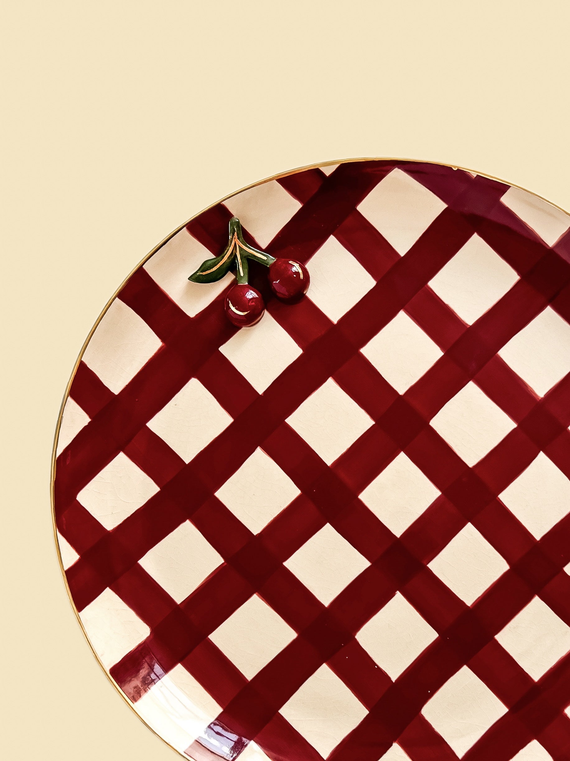 Descrição: Prato redondo multiuso em cerâmica, com borda crua, estampa xadrez vermelho pintada à mão e aplicação de cereja (4 cm de largura). Detalhes em ouro na borda e na cereja.