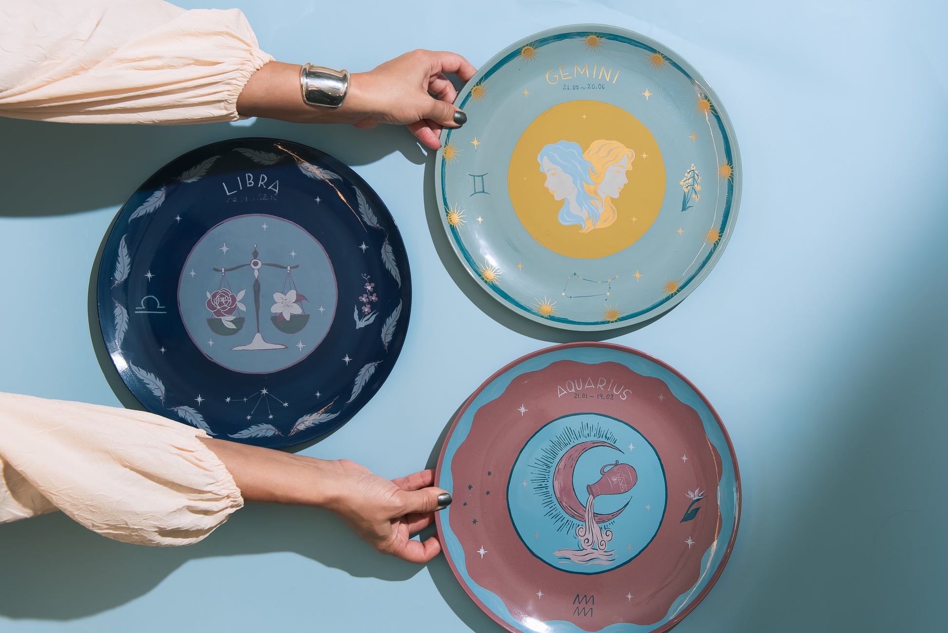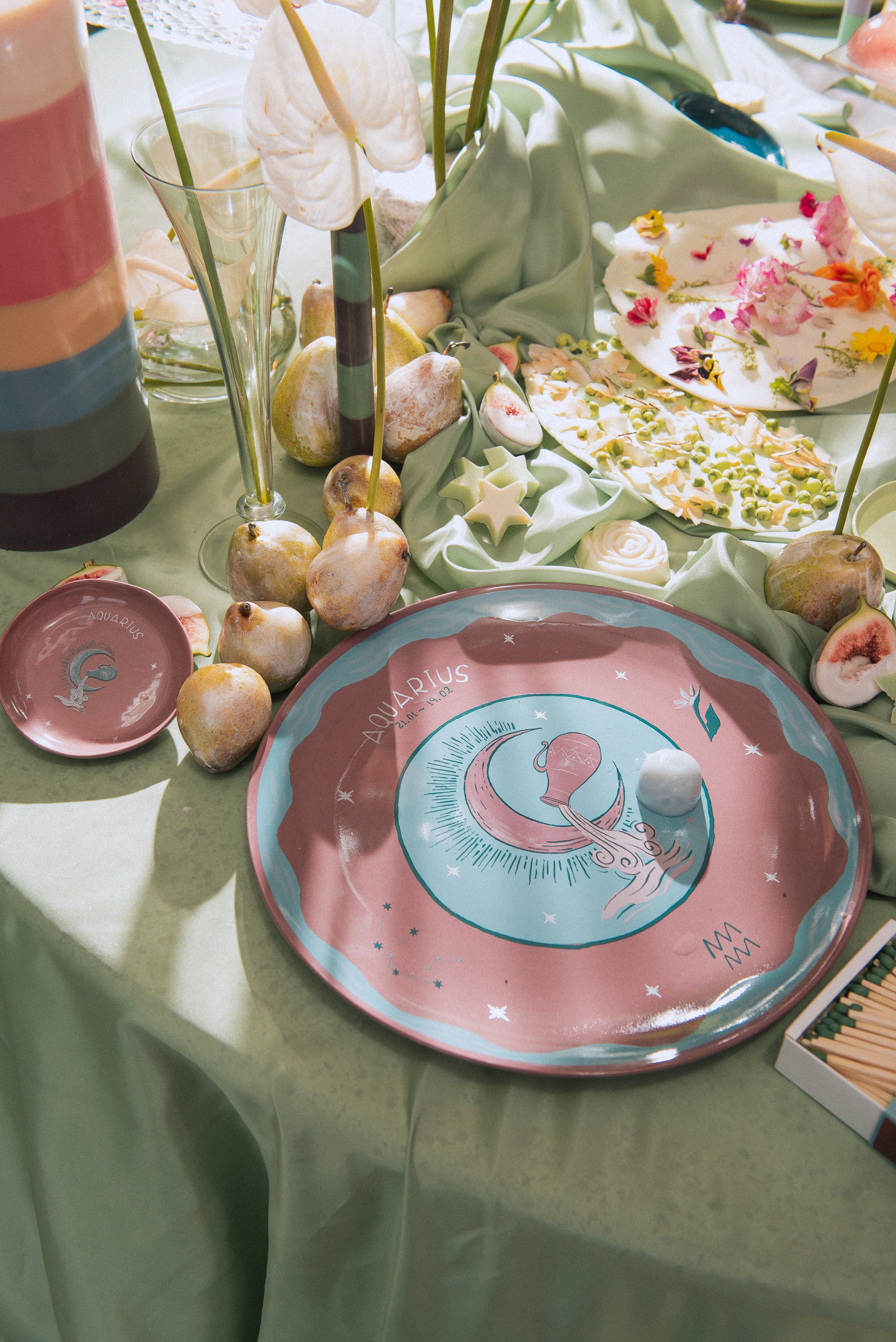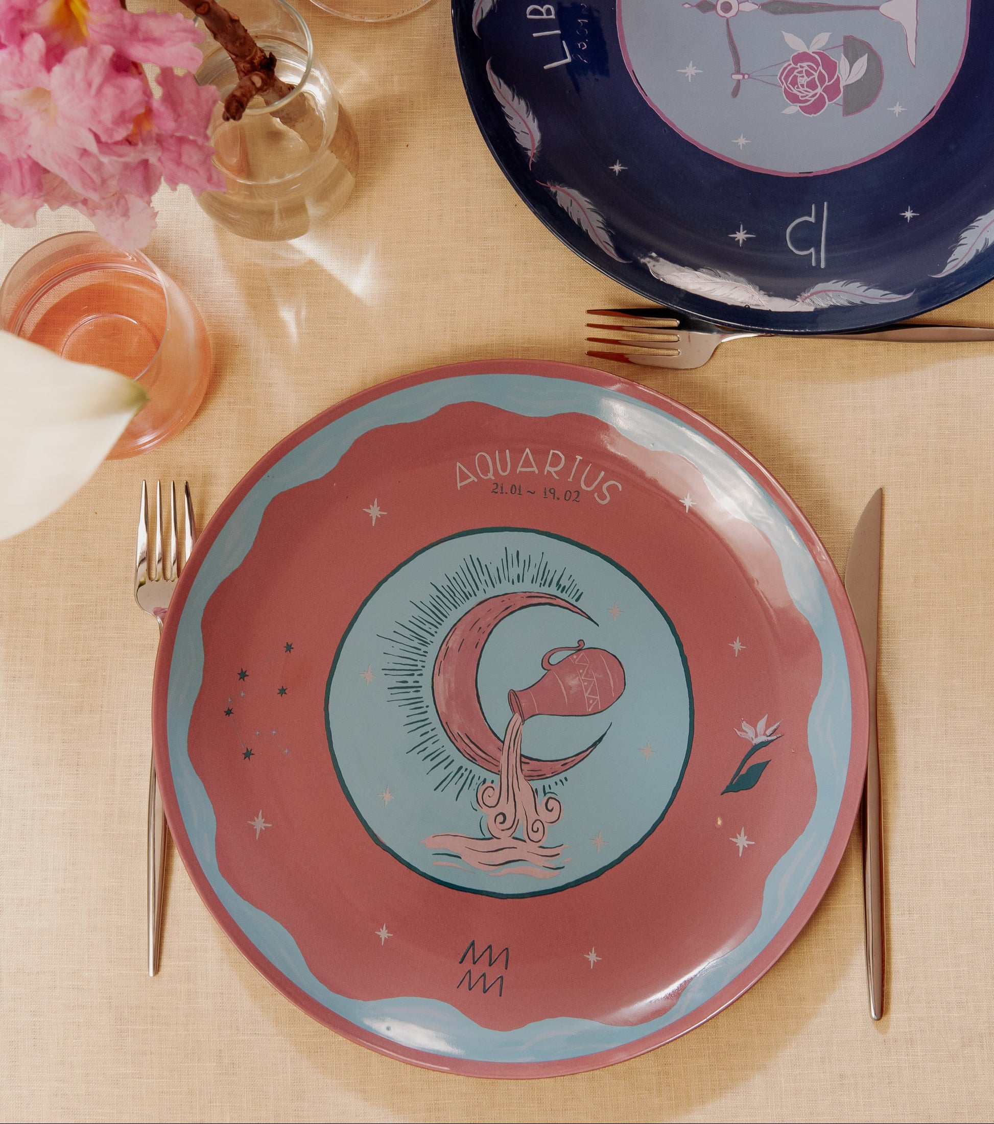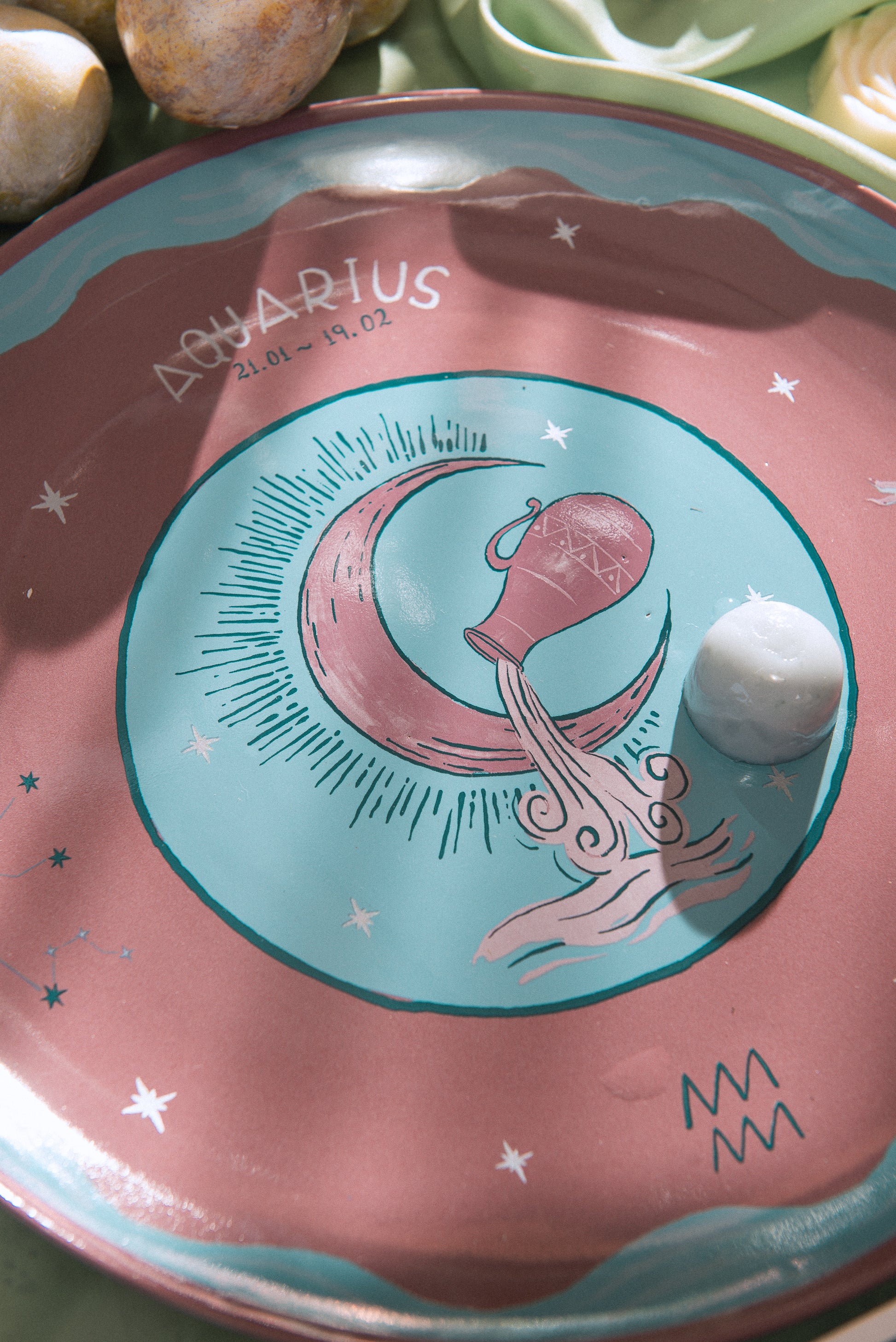 Prato em cerâmica raso moldado e esmaltado á mão, com aplicação de estampa cerâmica exclusiva desenvolvida para a coleção do signo de Aquário.