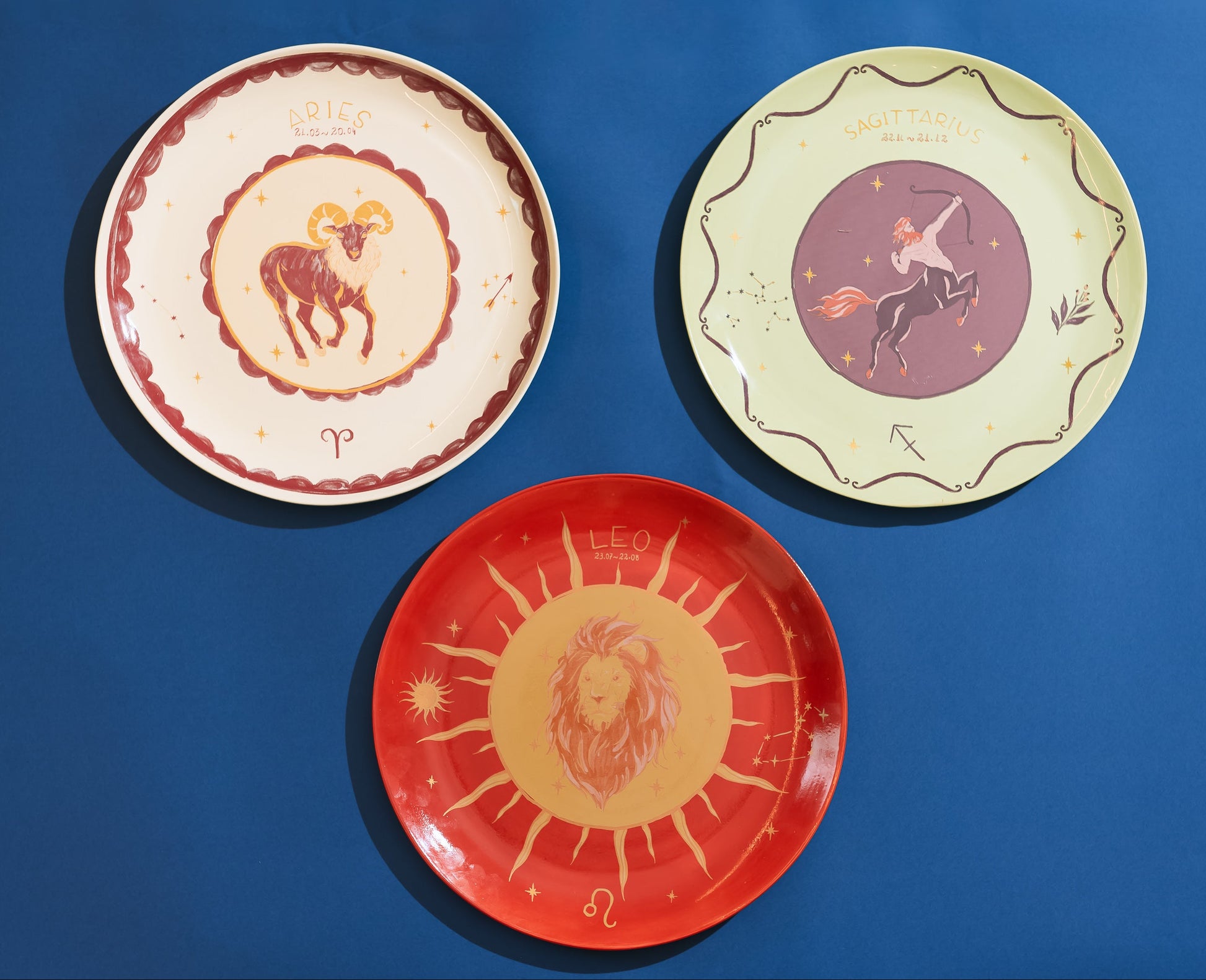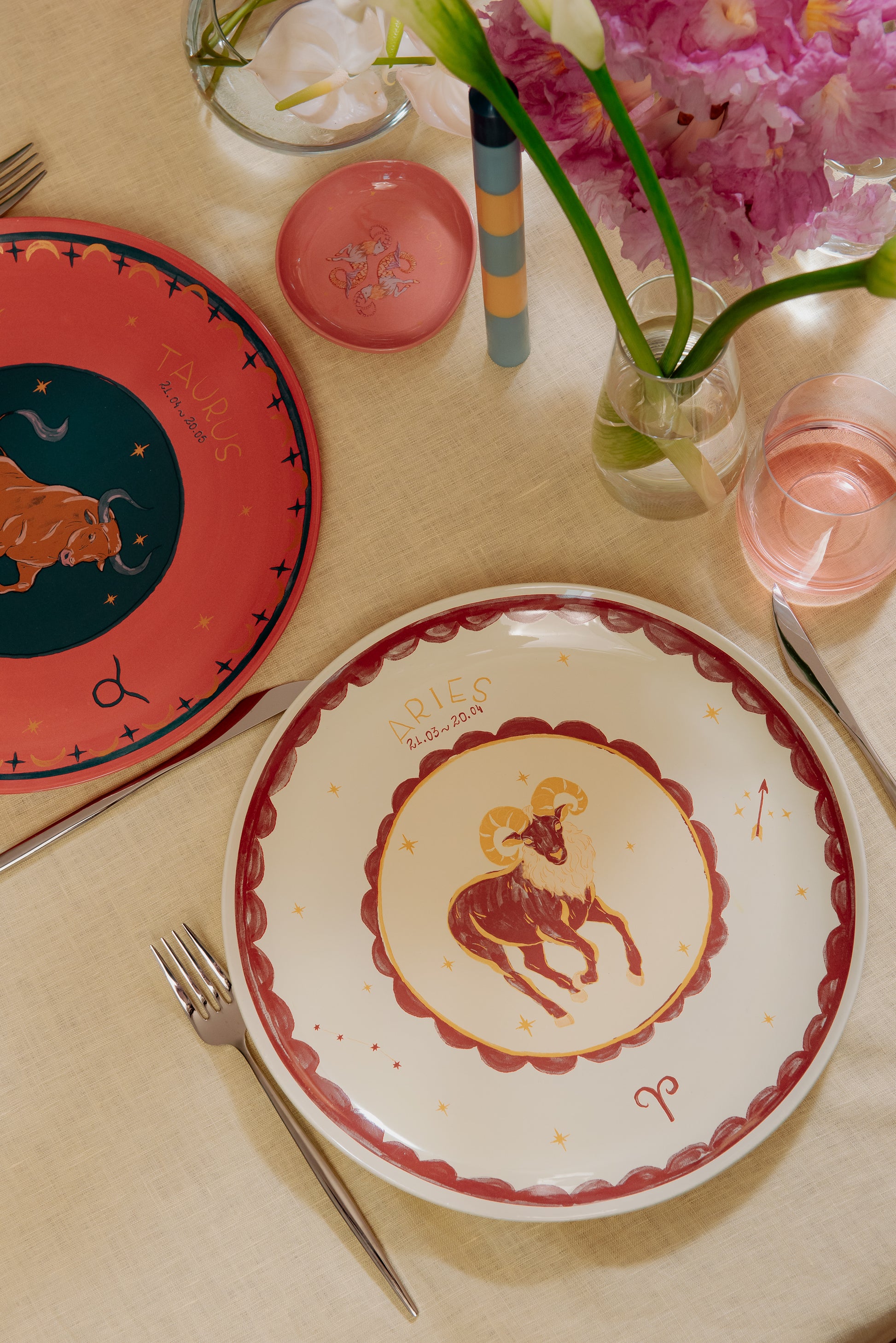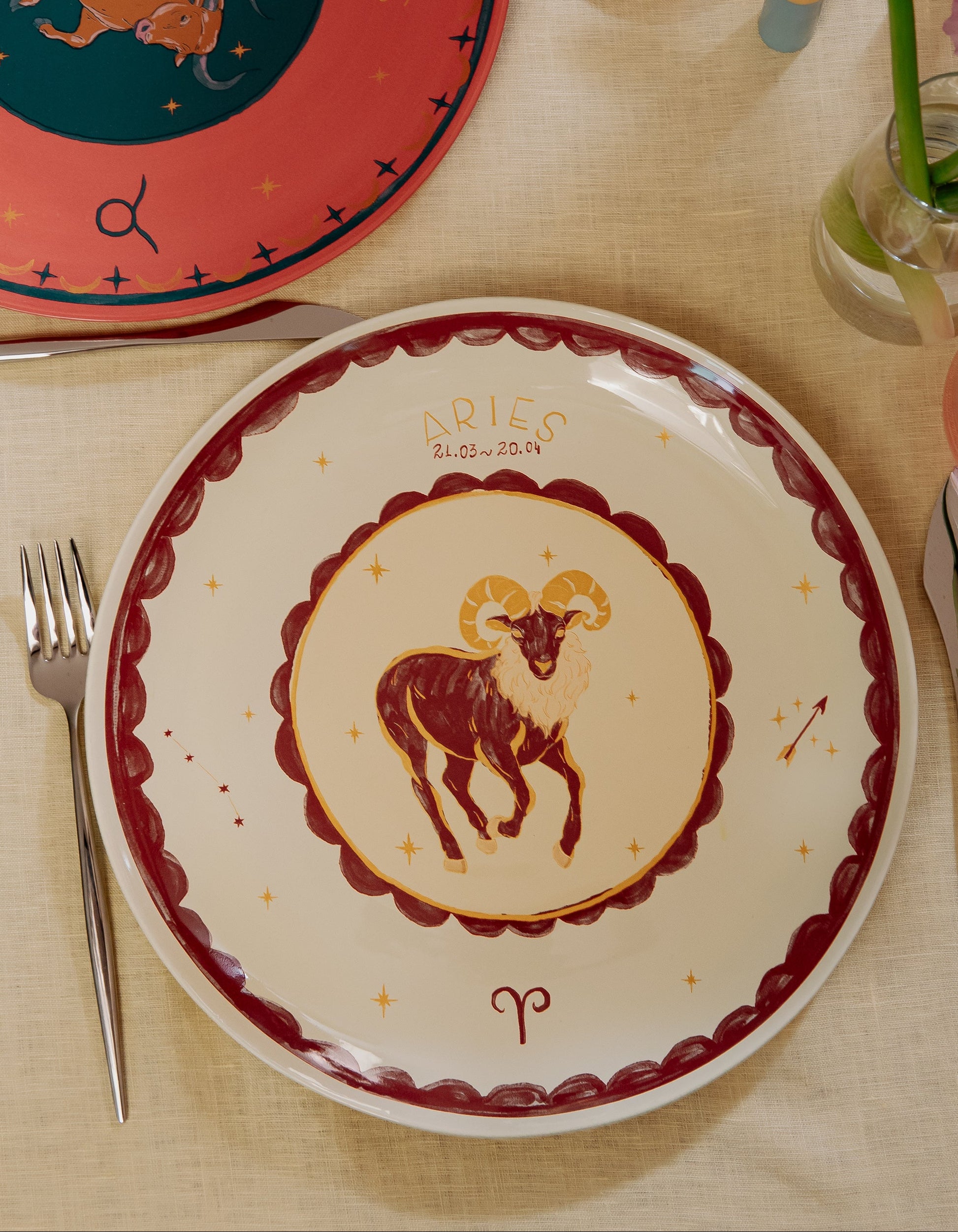 Prato em cerâmica raso moldado e esmaltado á mão, com aplicação de estampa cerâmica exclusiva desenvolvida para a coleção do signo de Áries.