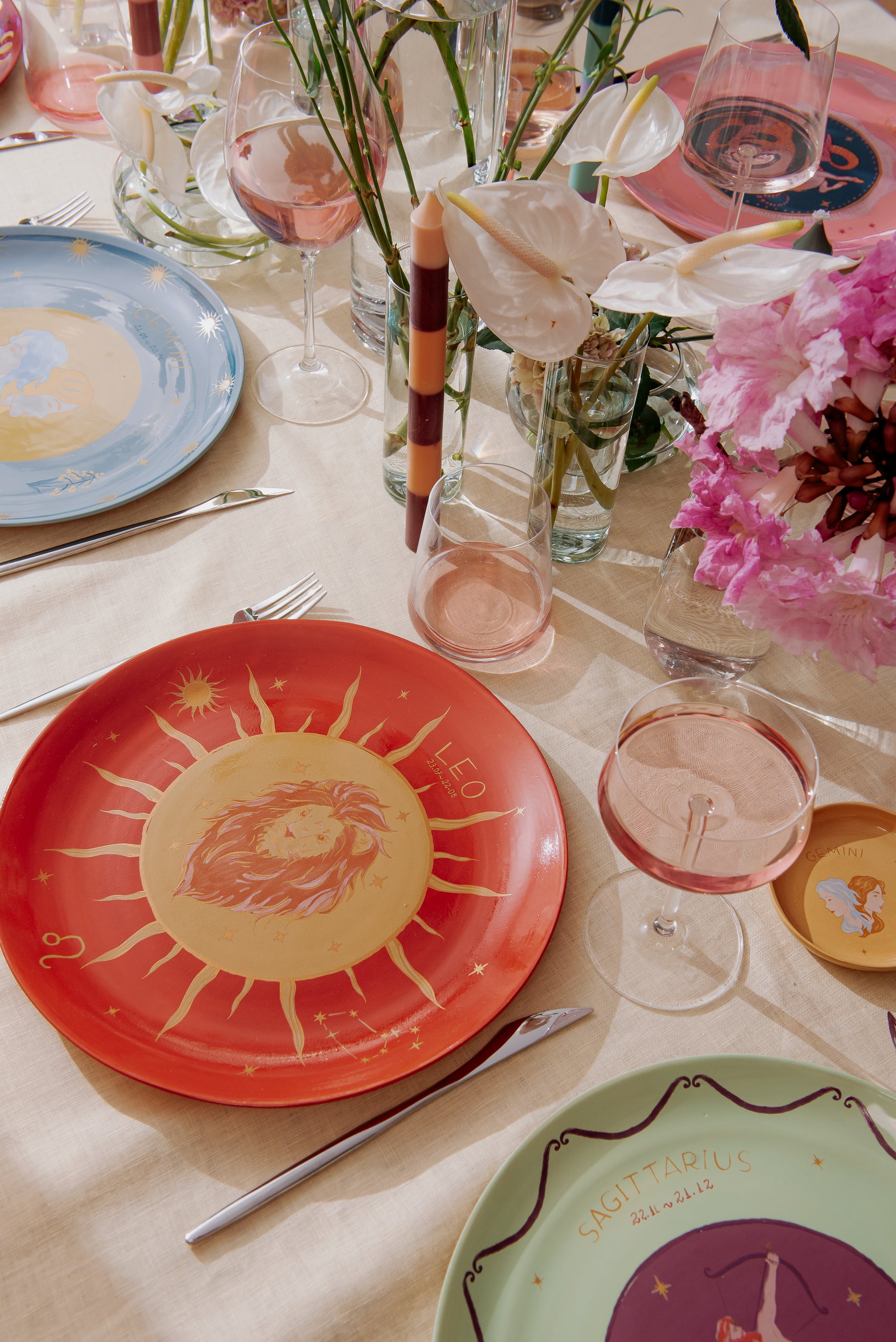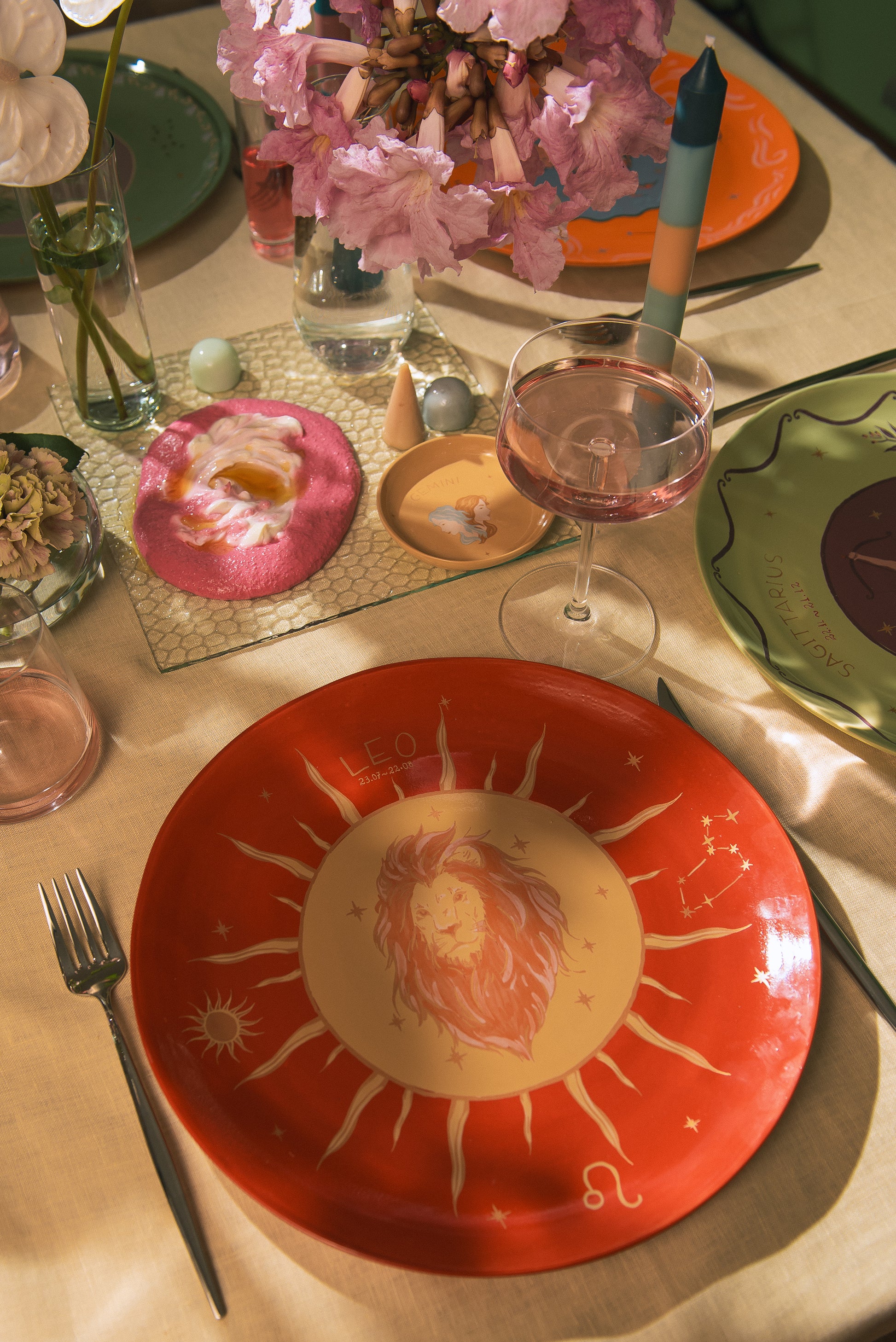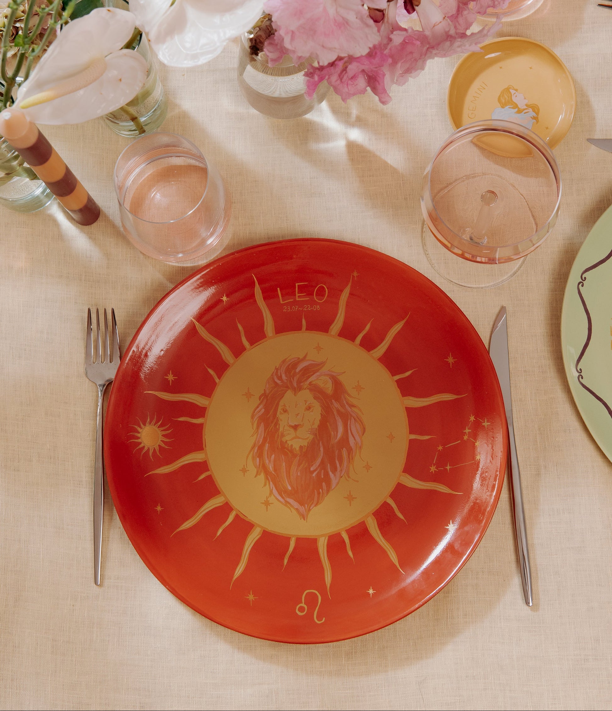 Prato em cerâmica raso moldado e esmaltado á mão, com aplicação de estampa cerâmica exclusiva desenvolvida para a coleção do signo de Leão .