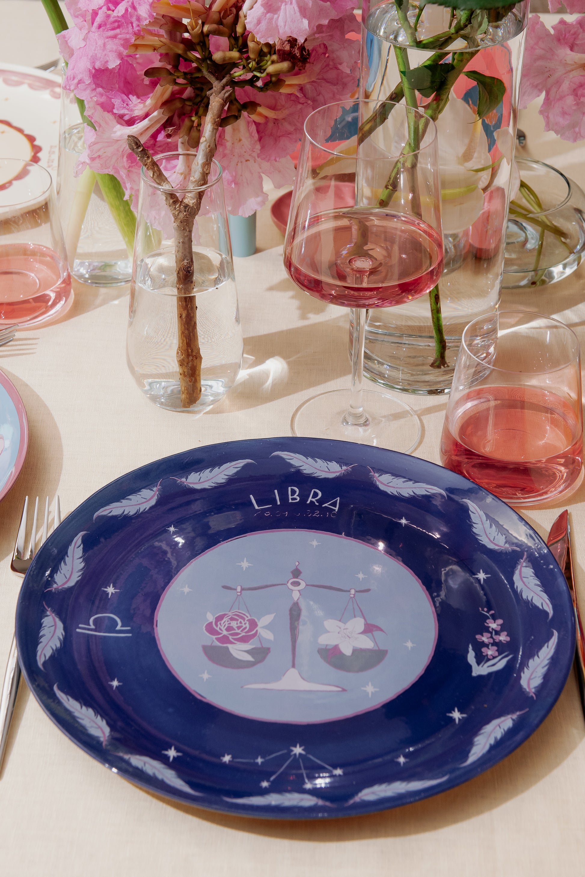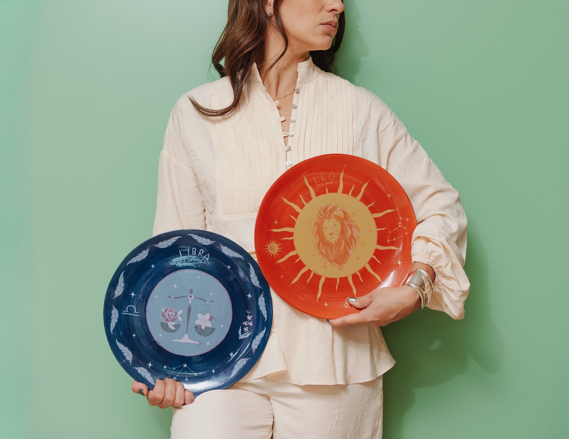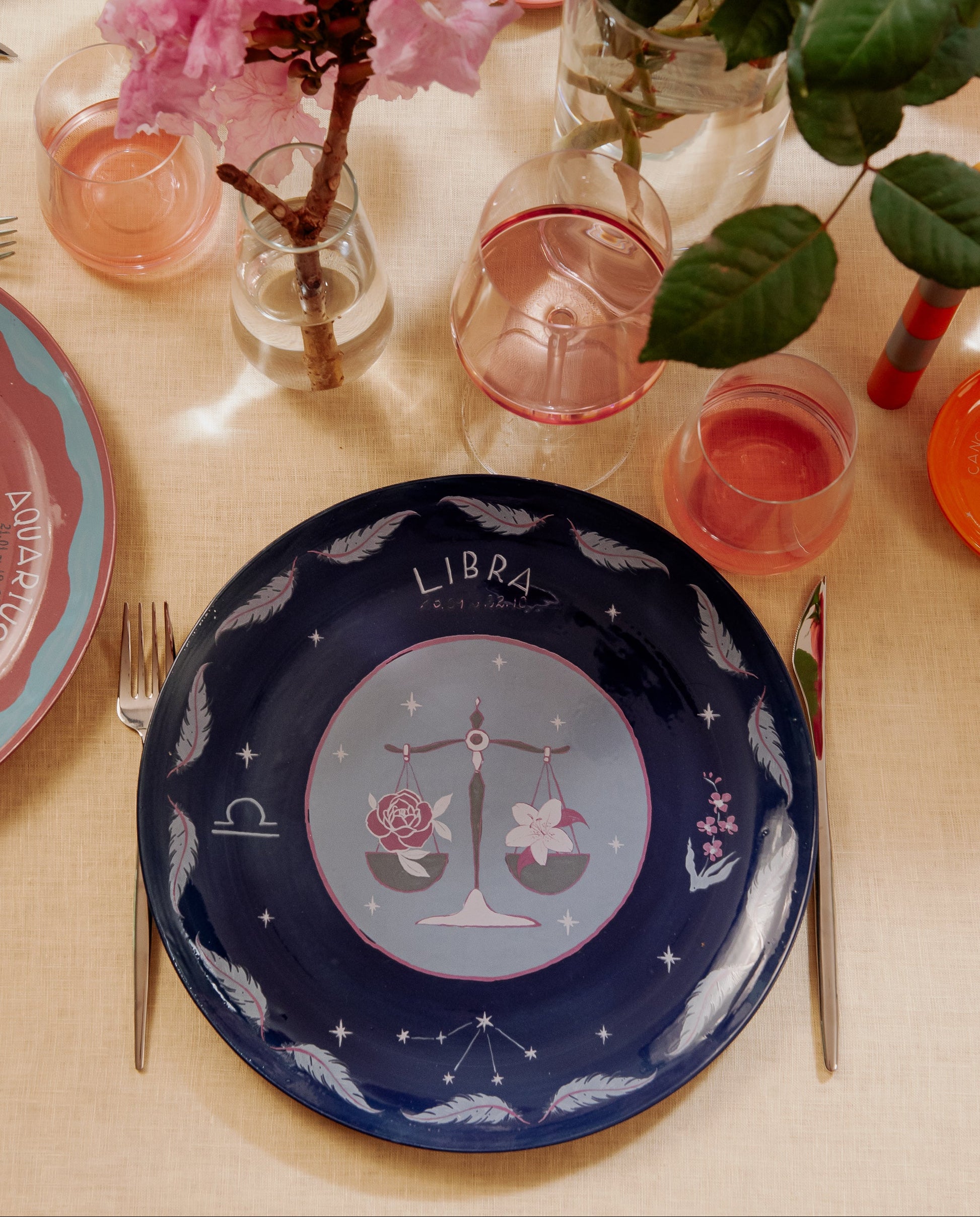 Prato em cerâmica raso moldado e esmaltado á mão, com aplicação de estampa cerâmica exclusiva desenvolvida para a coleção do signo de Libra.