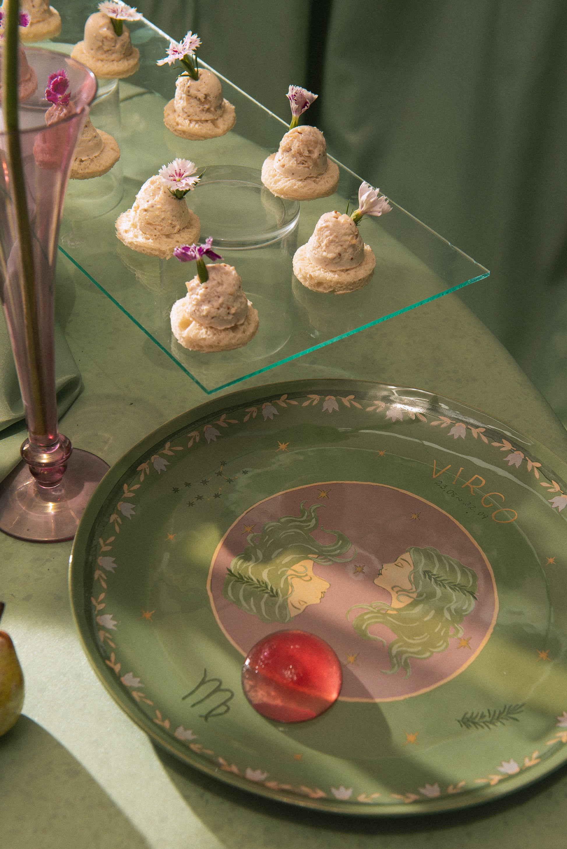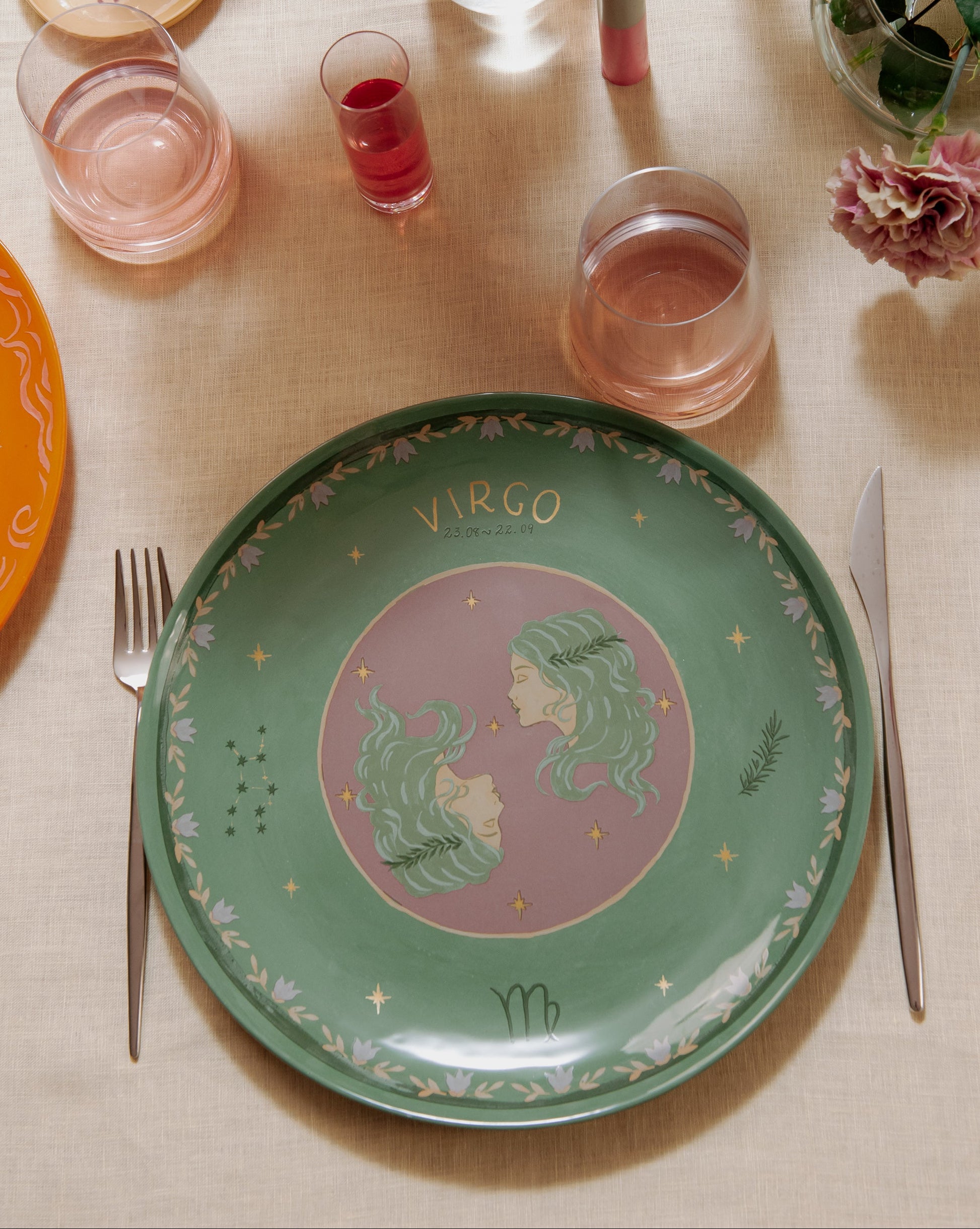 Prato em cerâmica raso moldado e esmaltado á mão, com aplicação de estampa cerâmica exclusiva desenvolvida para a coleção do signo de Virgem.