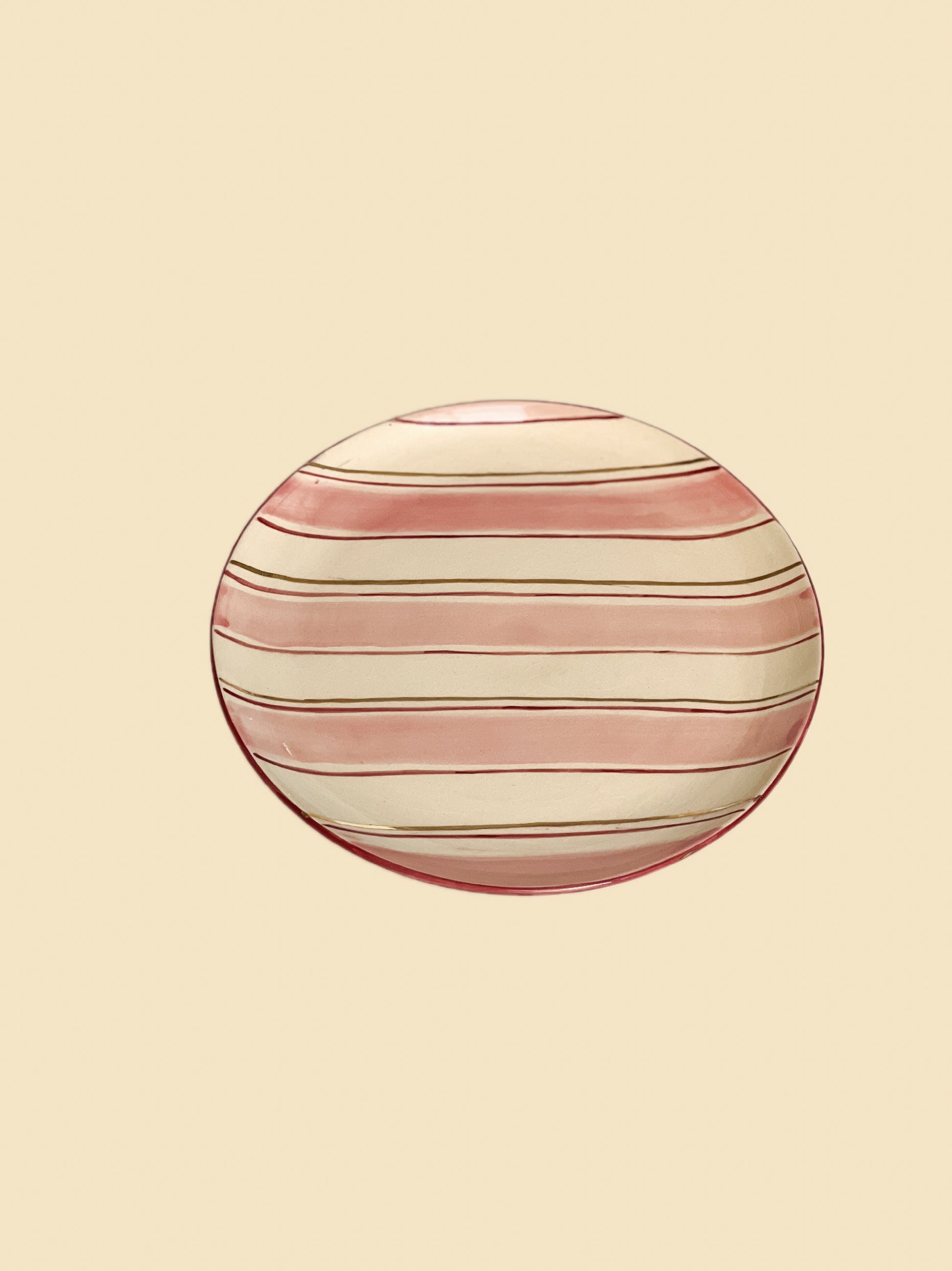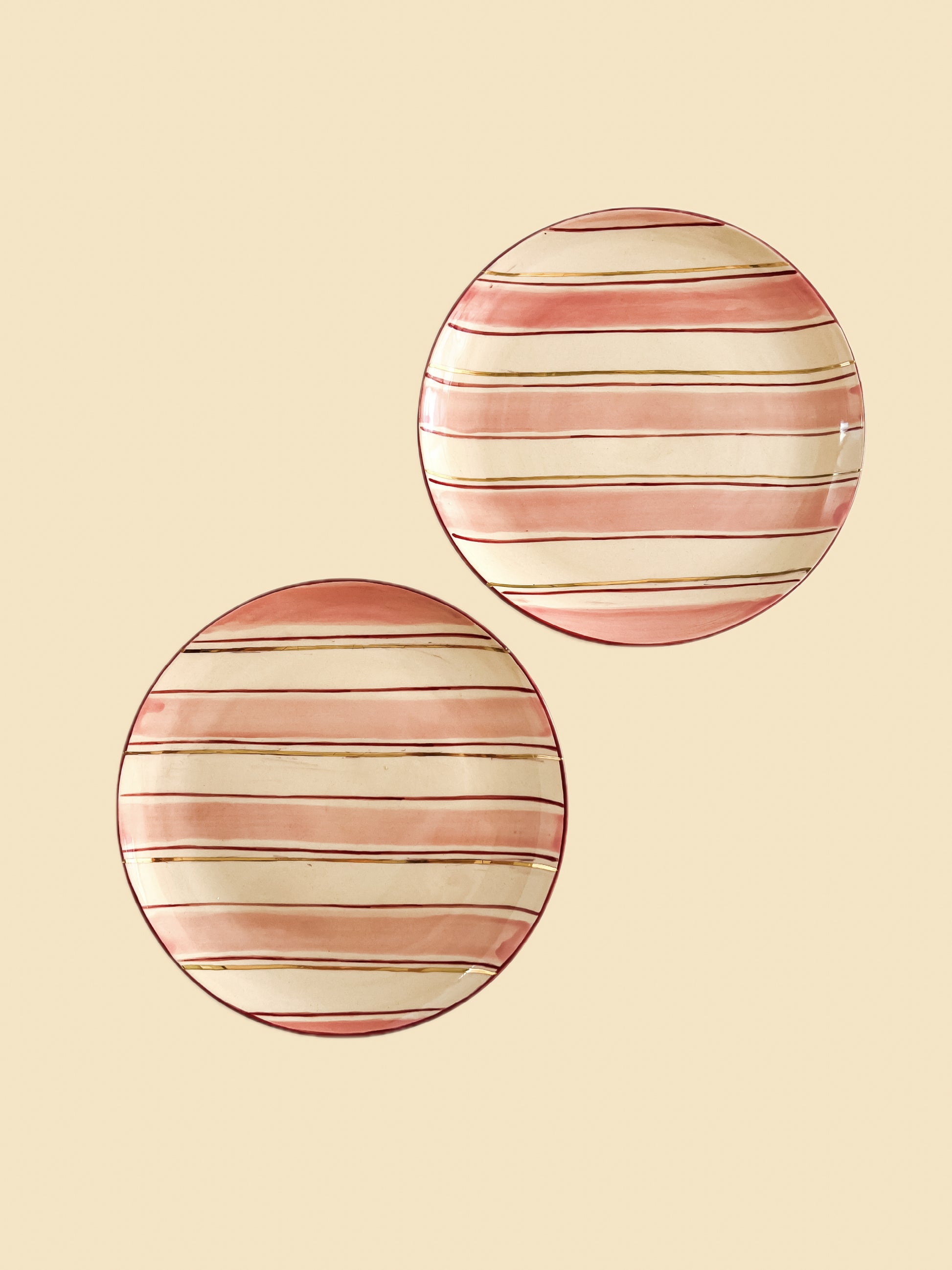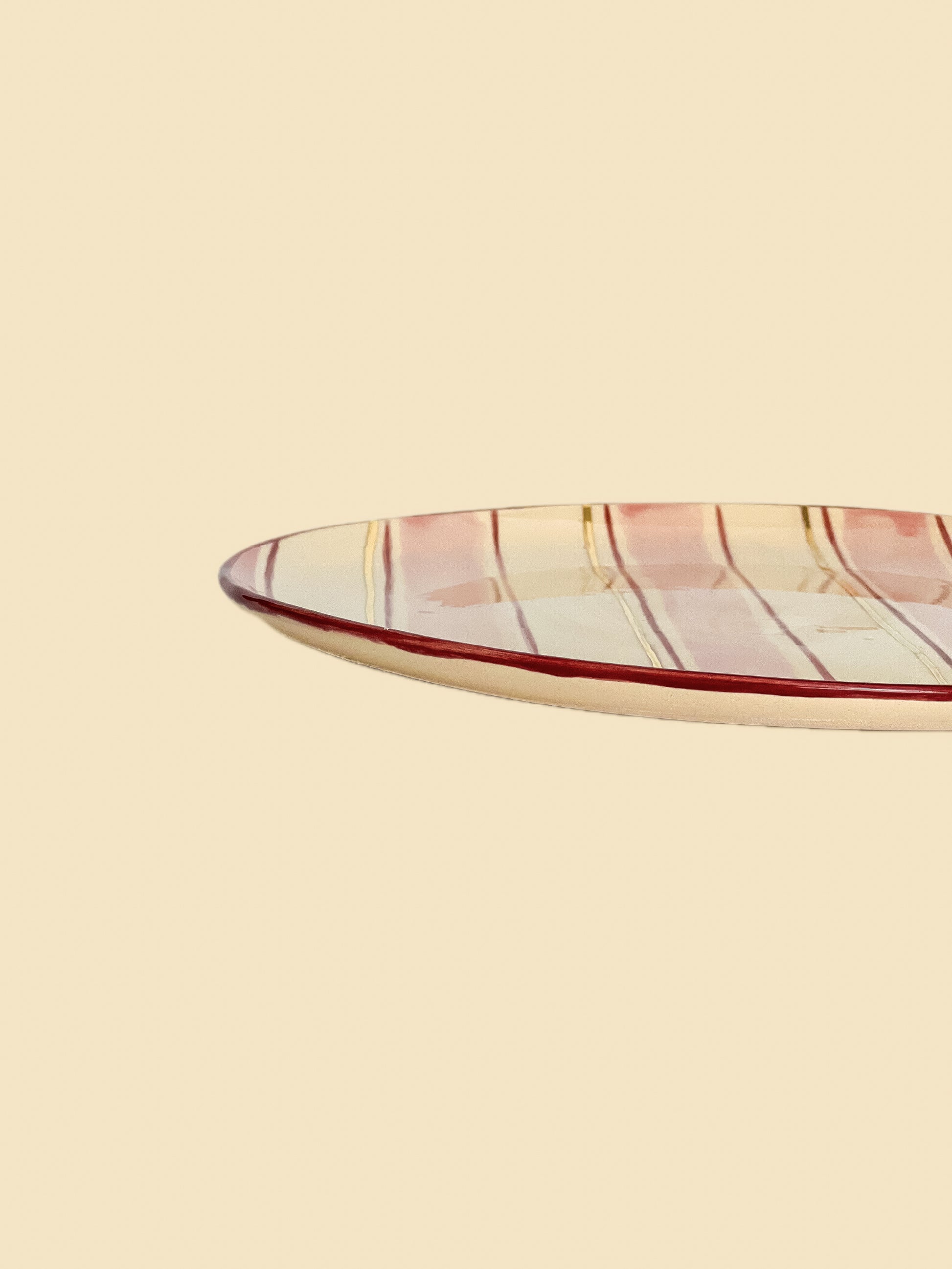Descrição: Prato de sobremesa com fundo cru listrado em vermelho e rosa com detalhes em ouro.