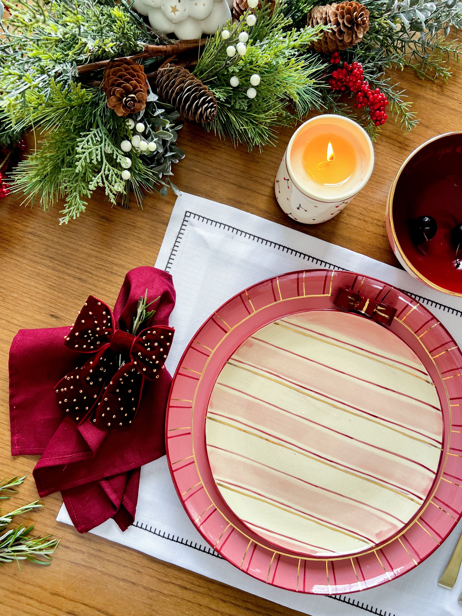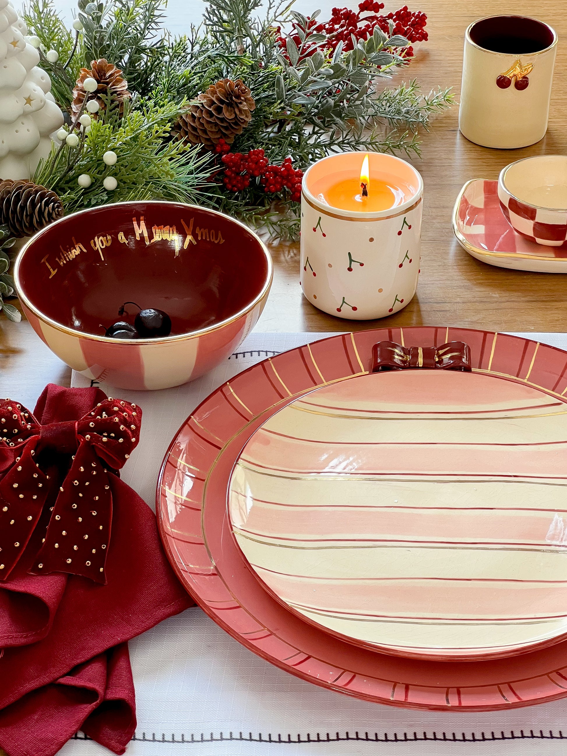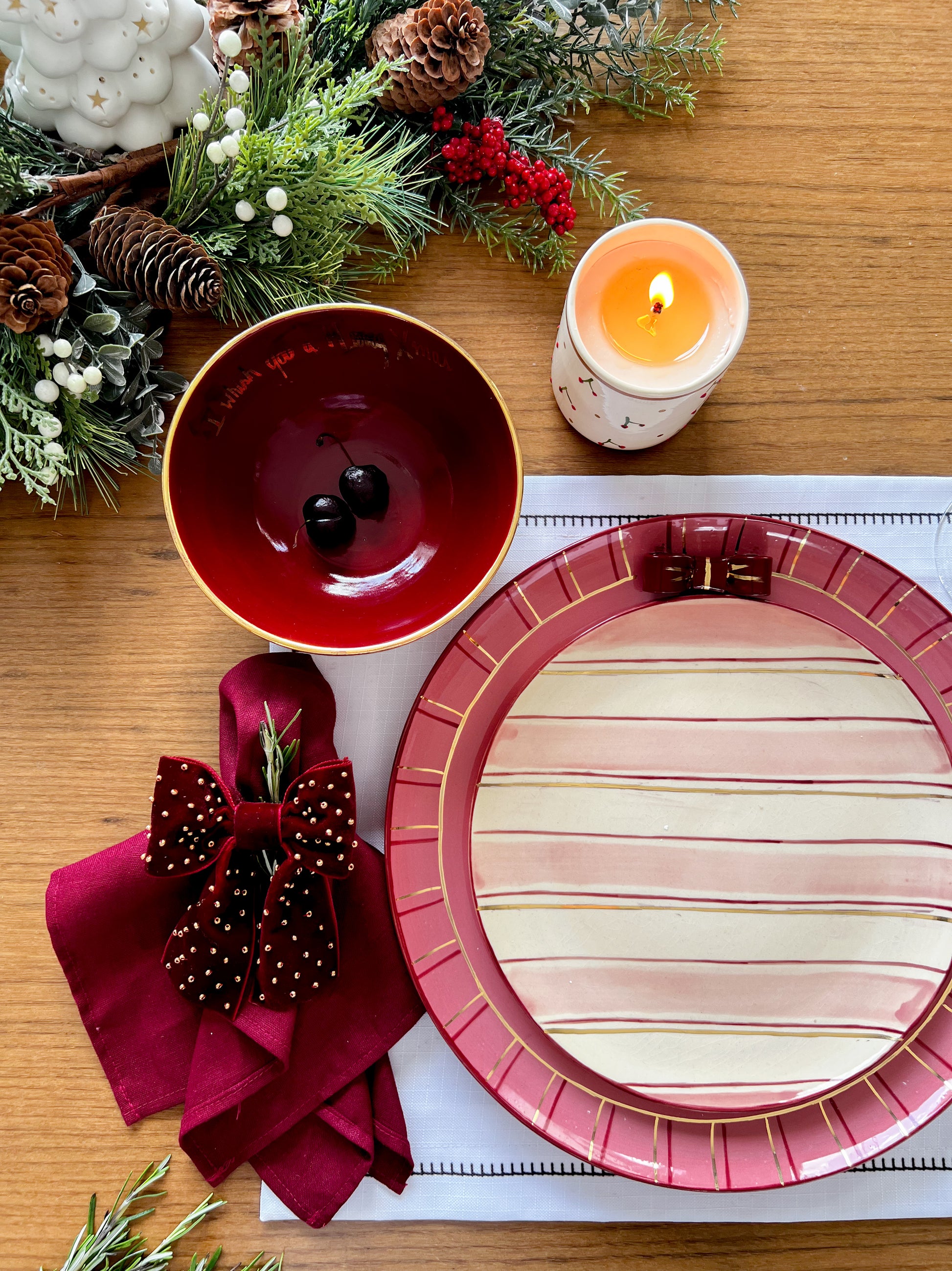 Descrição: Prato de sobremesa com fundo cru listrado em vermelho e rosa com detalhes em ouro.