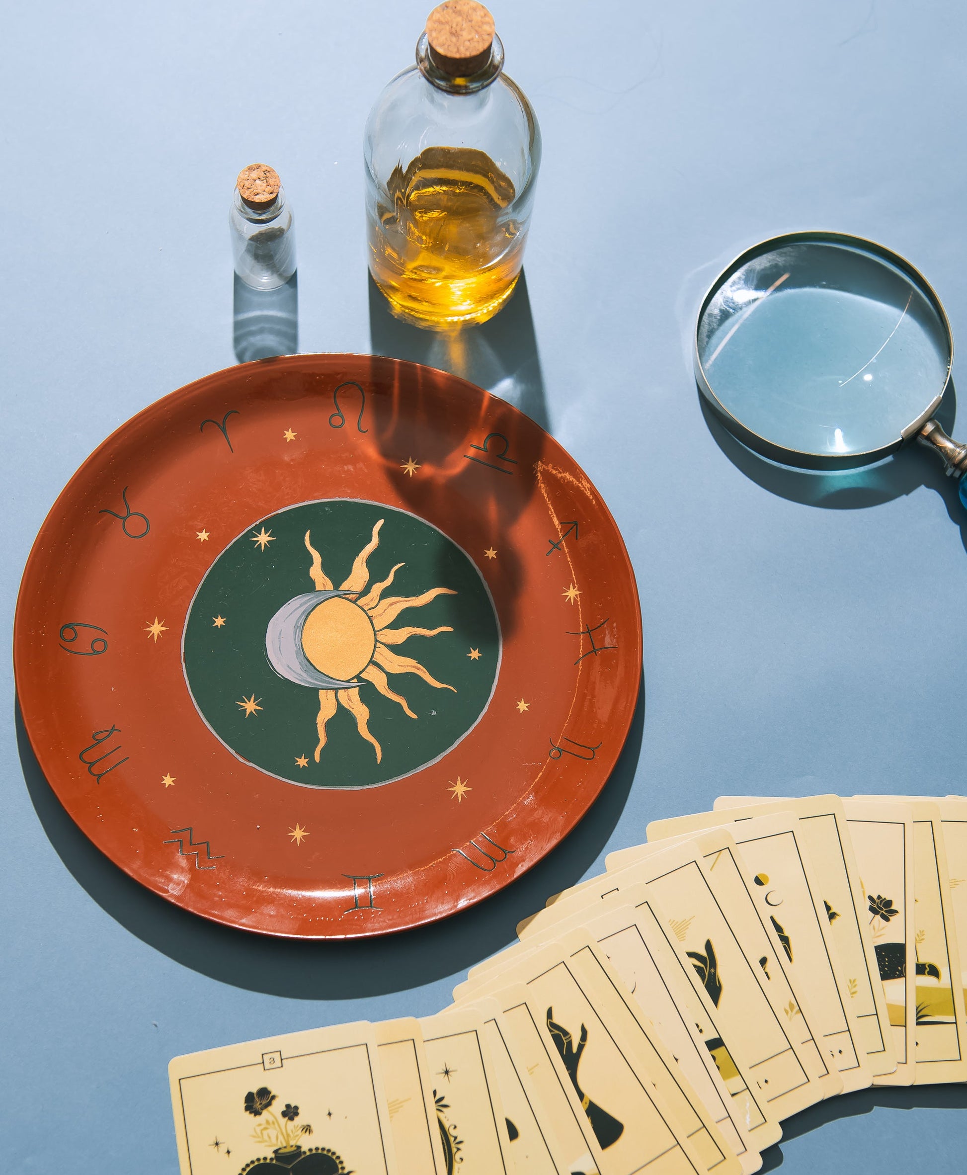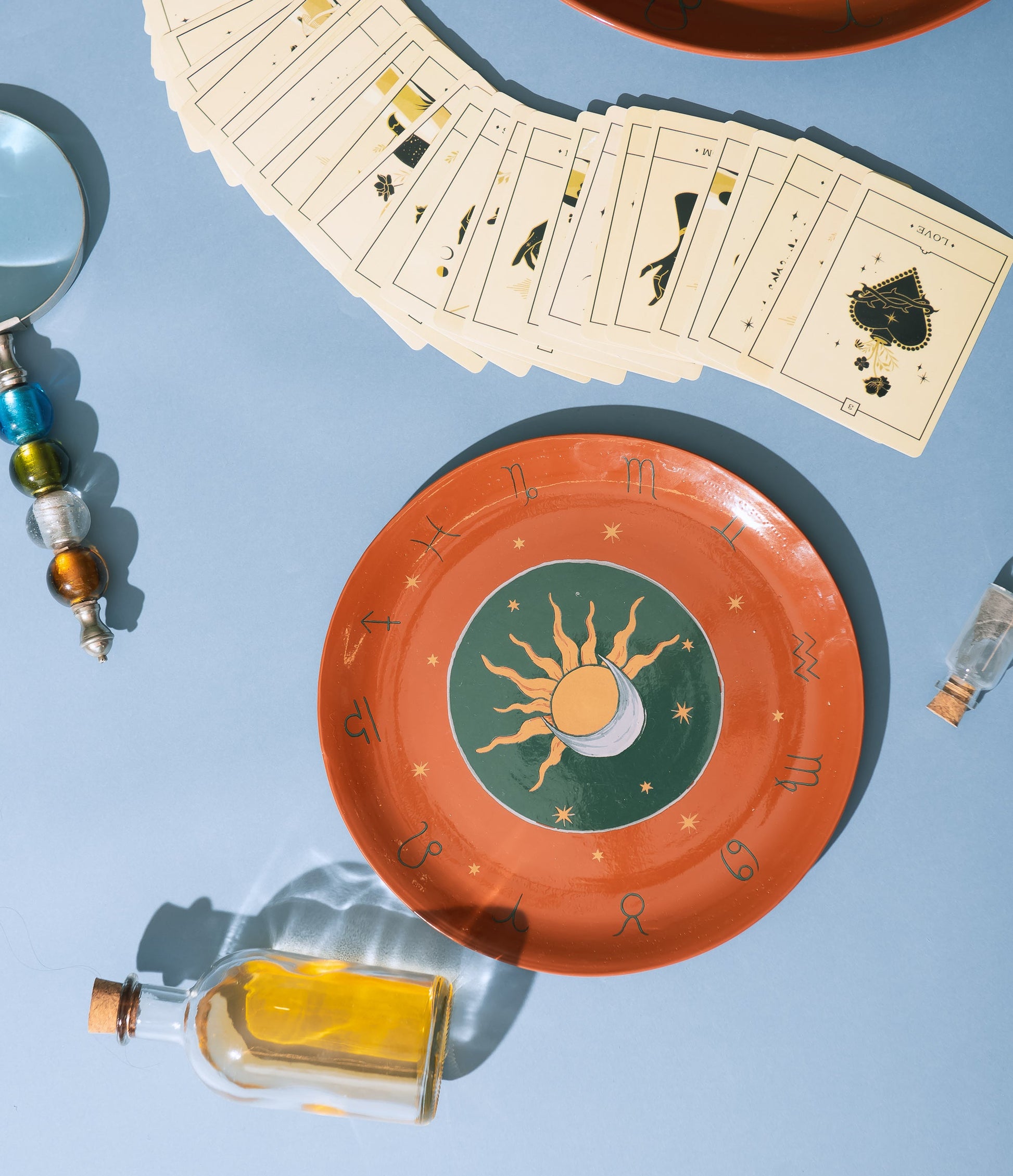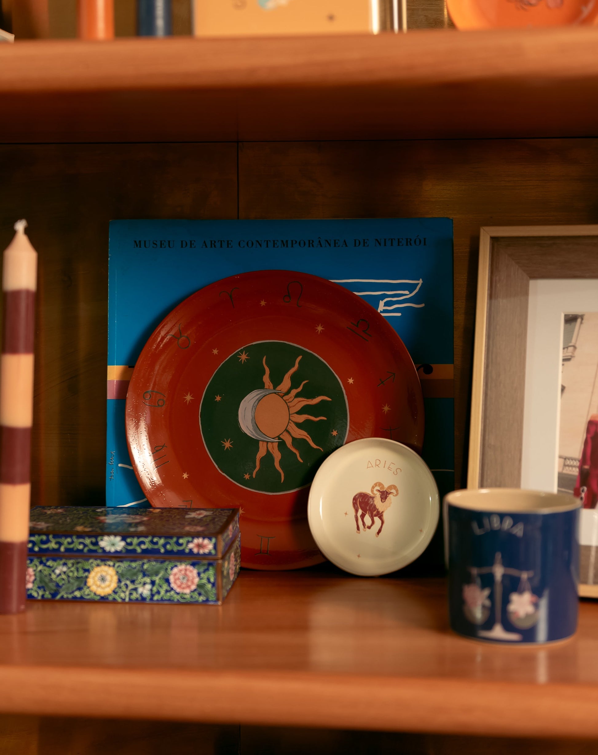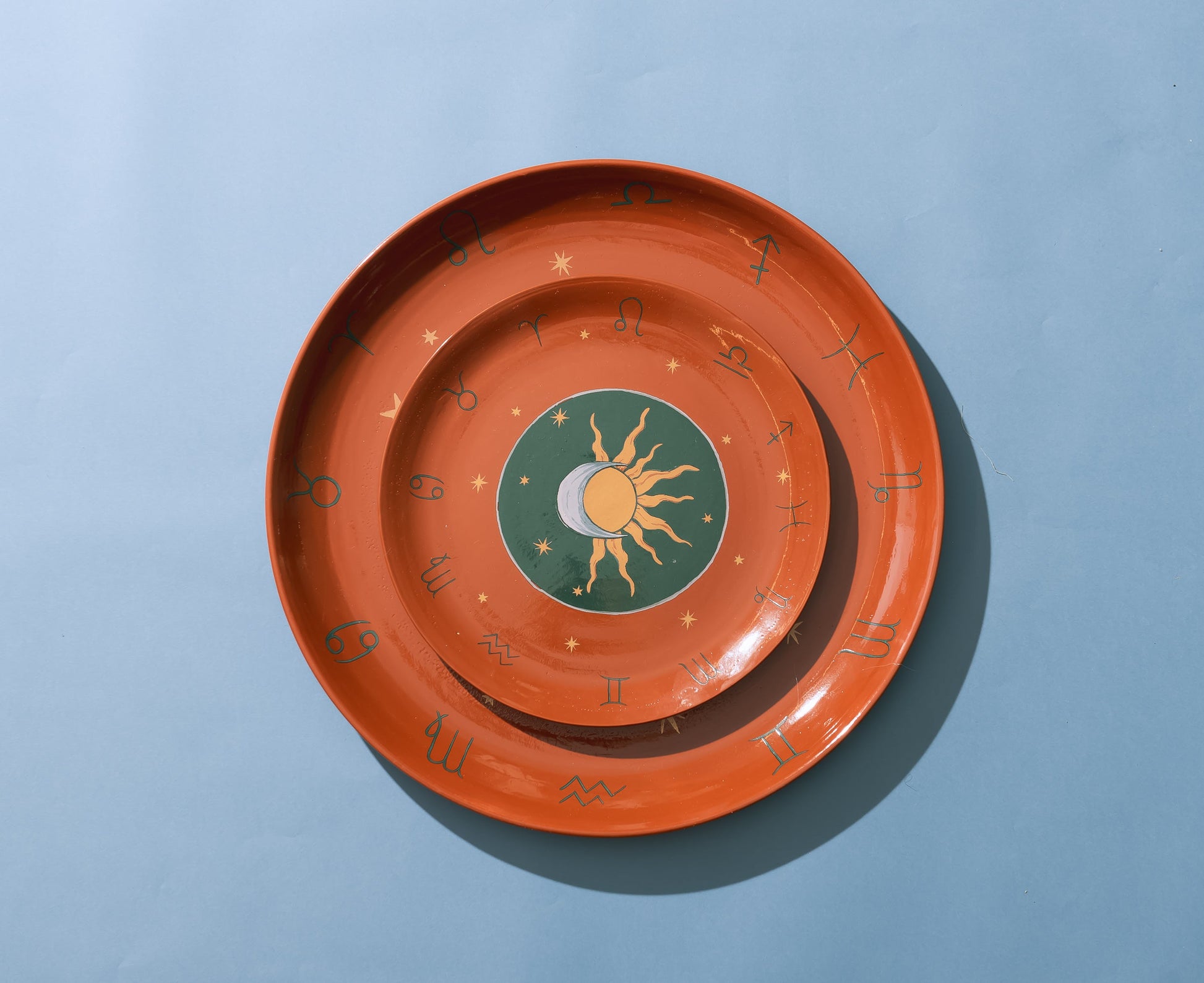 Prato em cerâmica tamanho sobremesa moldado e esmaltado á mão, com aplicação de estampa cerâmica exclusiva desenvolvida para a coleção de lua e sol.