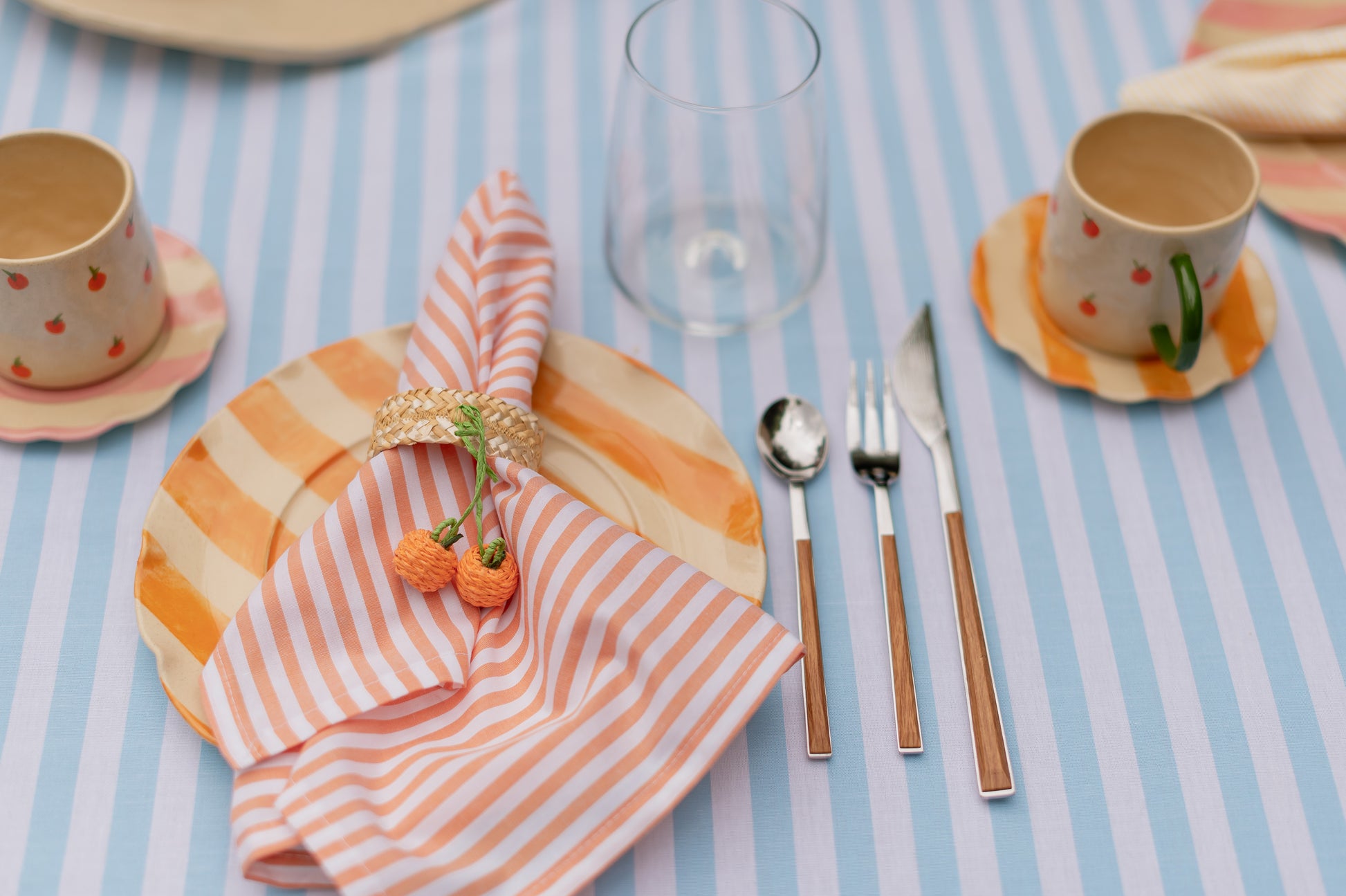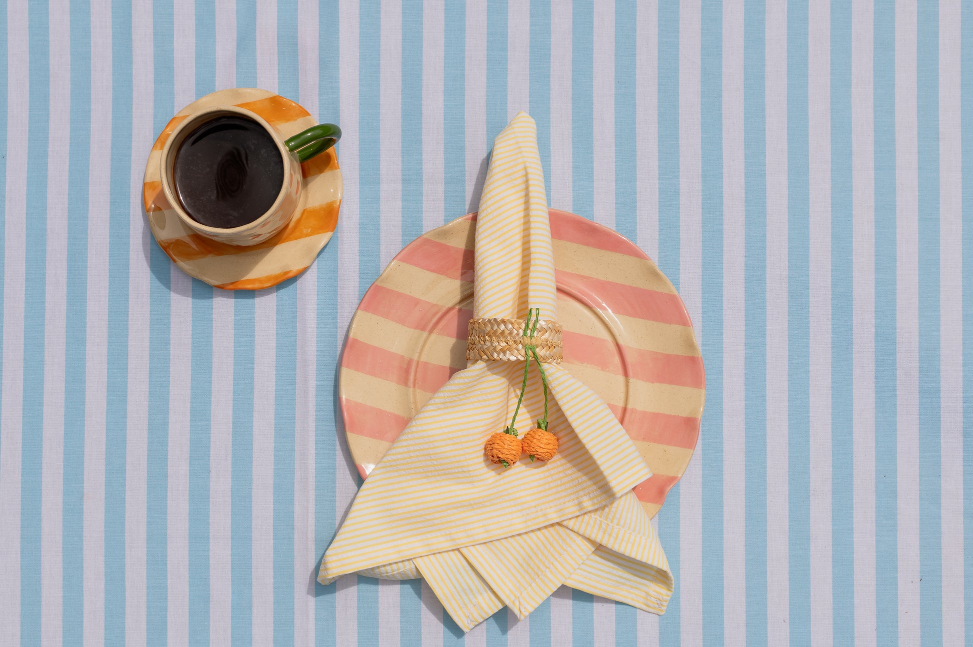 Descrição: Prato sobremesa em cerâmica de alta temperatura, pintado à mão com listrado de rosa e laranja, mesclando com toda a coleção nos tons do prato raso. A combinação de cores vivas e o traço orgânico tornam essa peça protagonista em qualquer mesa. A coleção Mandarine, é perfeita para composições criativas, solares e nada óbvias.