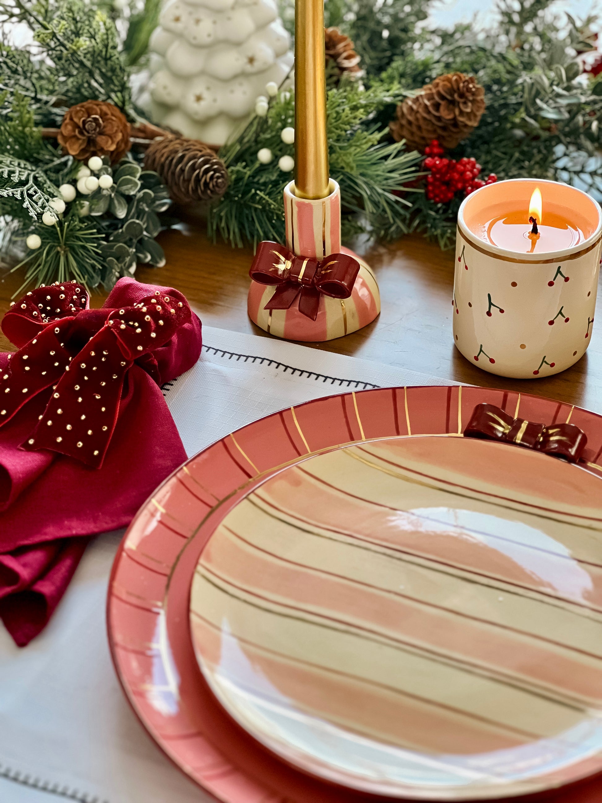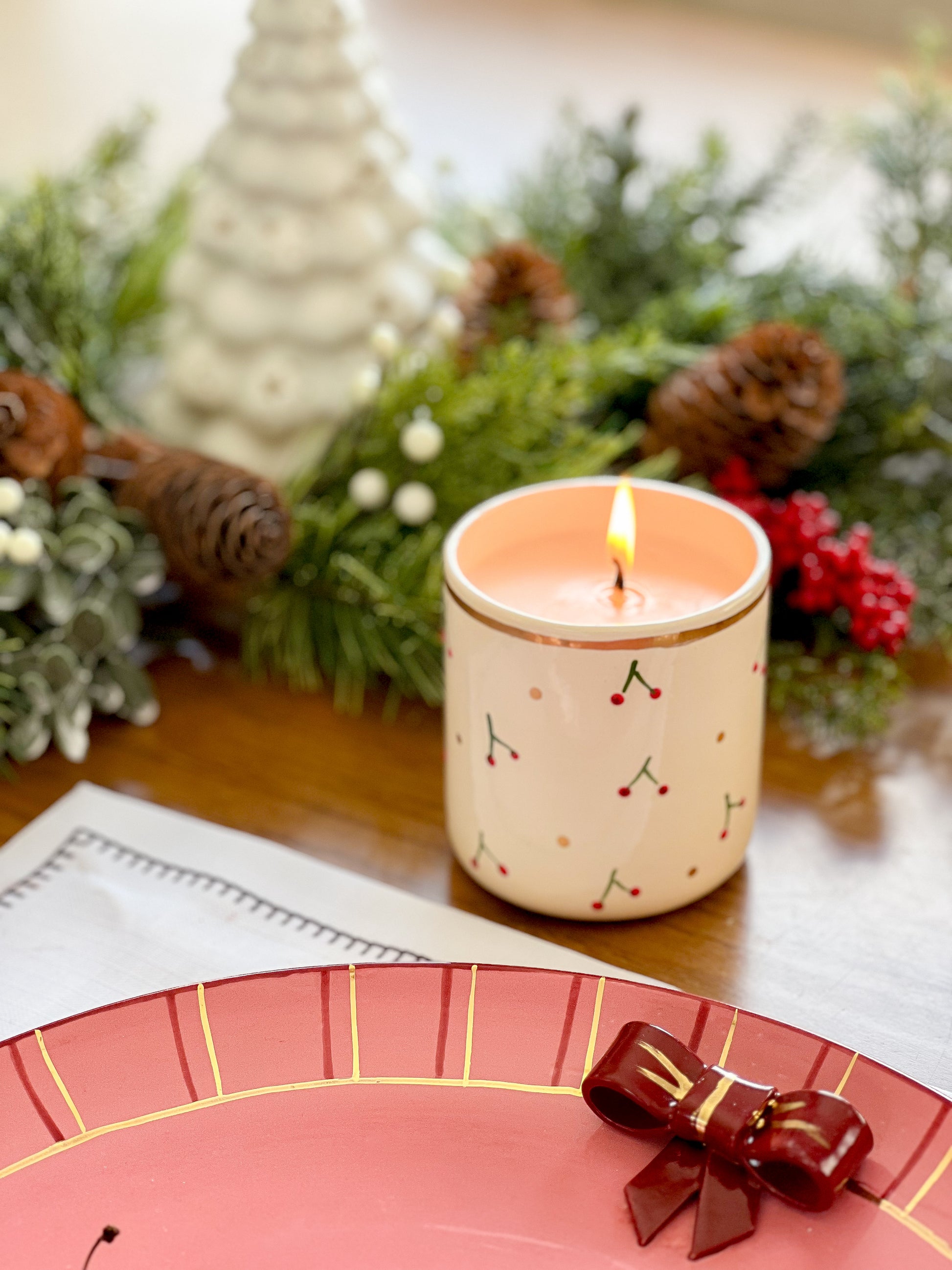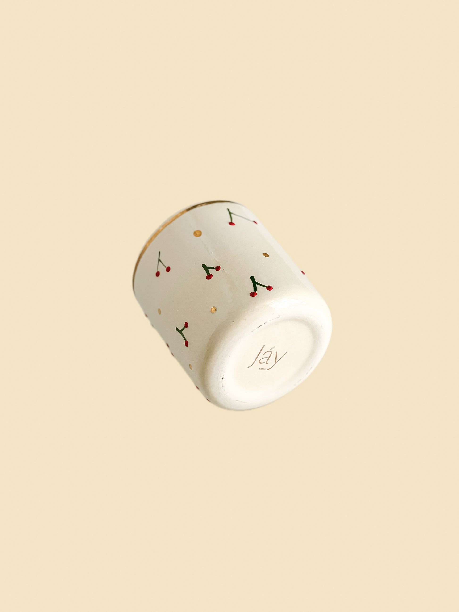 Descrição: Copo de vela pintado à mão com mini cerejas e detalhes em ouro.