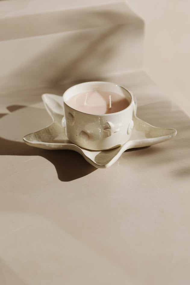 Material: Copo de vela em cerâmica com elementos do mar aplicados e vela com essência de praia com dois pavios