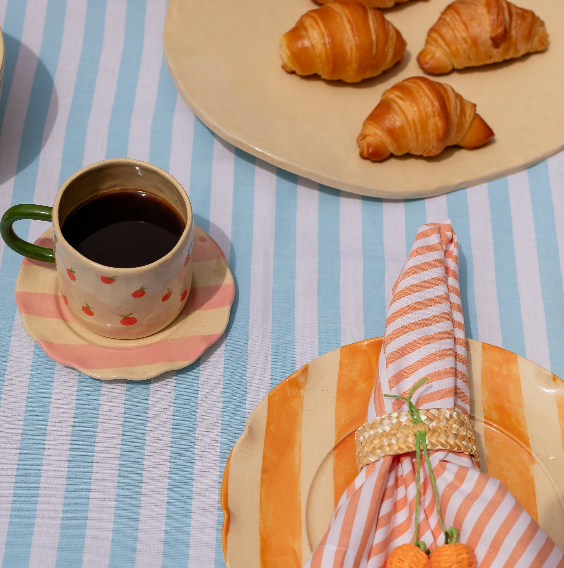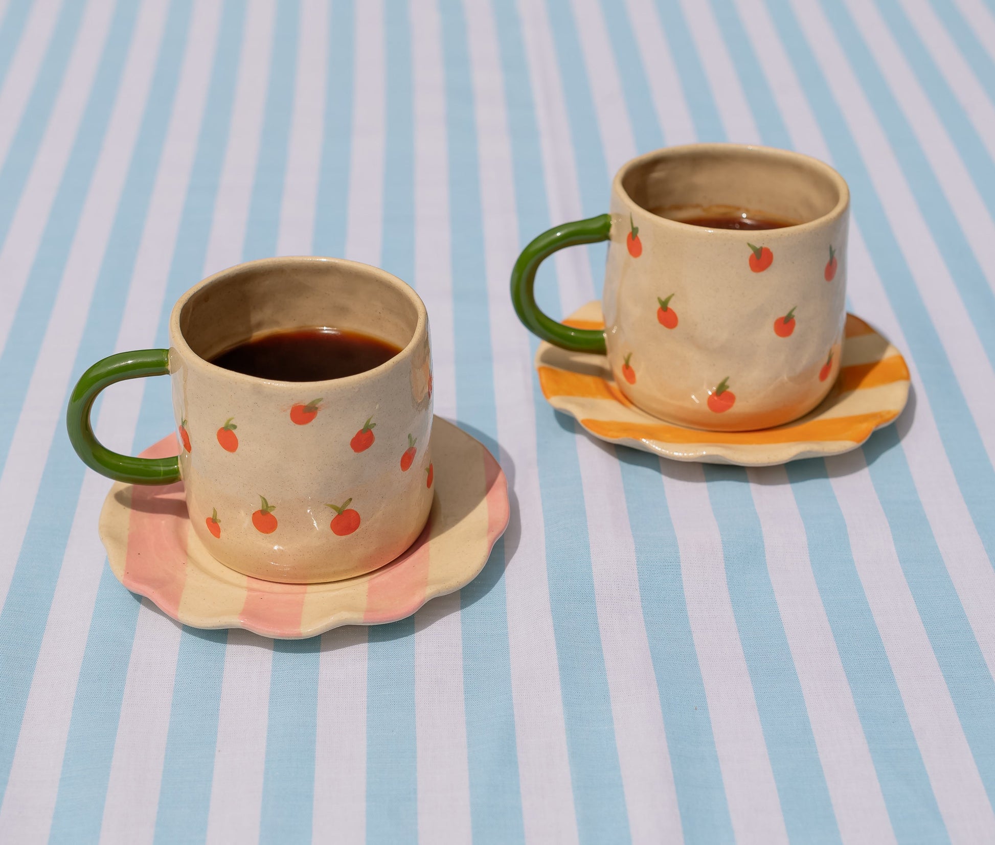 Descrição: Xícara para café ou chá feita em cerâmica de alta temperatura, pintada à mão com pequenas tangerinas sobre base na cor cru. Acompanha pires listrado nos tons vibrantes da coleção Mandarine. Uma composição feita à mão cheia de personalidade, para transformar sua rotina em pequenos rituais cheios de autenticidade e cor.